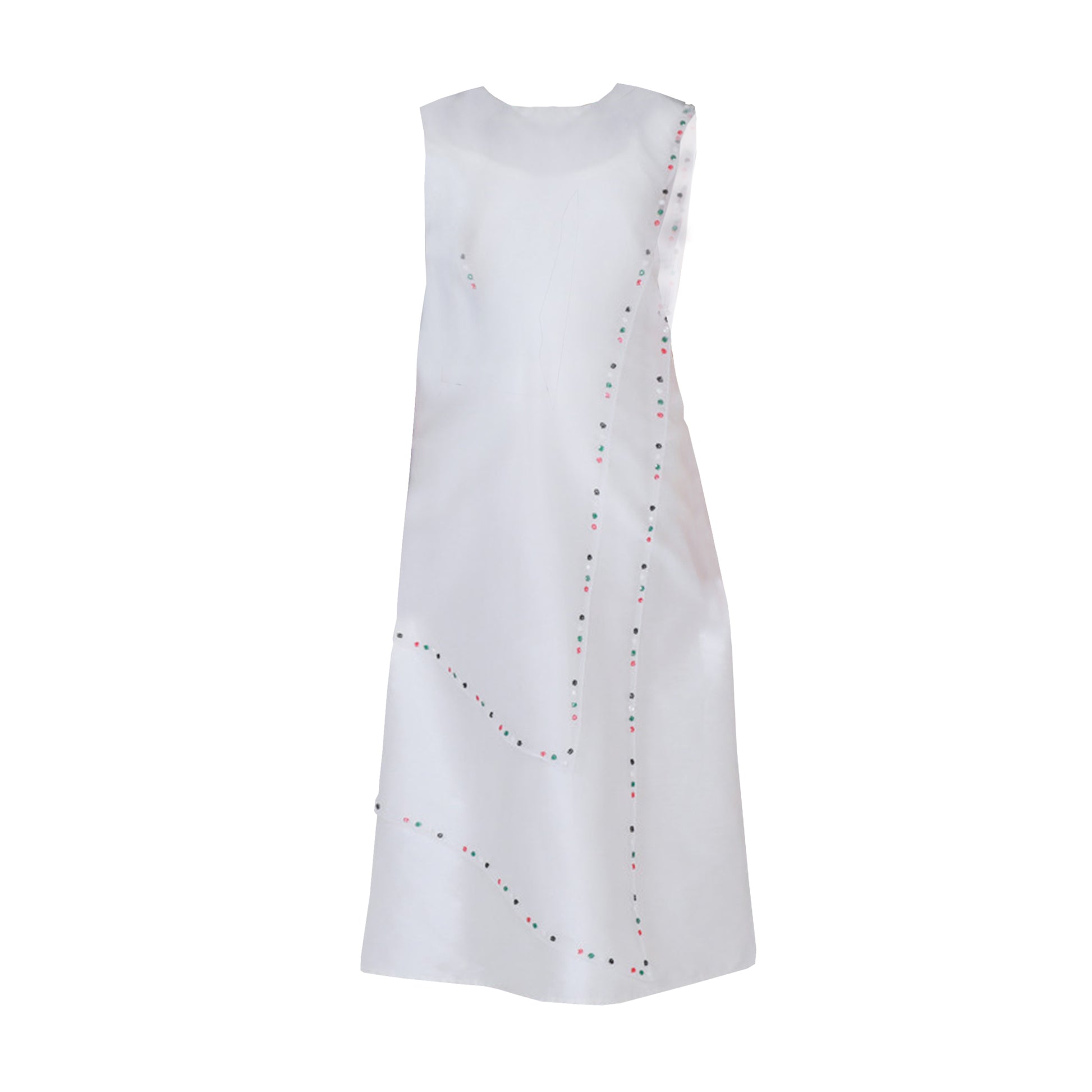 The national day dress of luxurious Shanja and soft tulle of an off-white color. A wonderful dress without sleeves. The design is in the form of side layers of tulle on one side of the dress in the form of triangles decorating the edges of the layers with elegant, shiny beads from the colors of the flag in a creative, artistic, high-end image it Shows the skill of design and the art of sewing, which added a charming touch to the dress