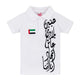 A sleek and classic white t-shirt featuring a collar neck and comfortable half sleeves. This t-shirt is adorned with an elegant black-colored Arabic calligraphy embroidery on one side, adding a touch of sophistication. On the other side, it proudly displays the UAE flag, combining style and national pride seamlessly. Crafted from Dri-Fit fabric, this shirt ensures comfort and moisture-wicking properties for a perfect blend of fashion and functionality.
