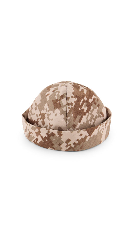 An army print newborn baby fabric double-cut top cap, available separately to pair seamlessly with the army print romper. This cap boasts a unique design with two stylish cut-outs on top, ensuring your little one stays fashion-forward while maintaining comfort and coordination with the romper's camouflage pattern.