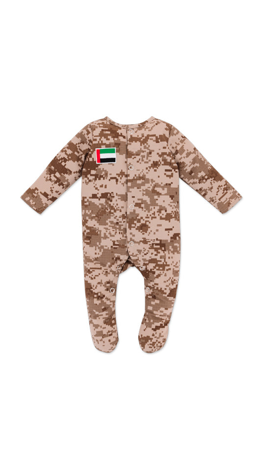 Introducing our Military-themed Baby Romper, a perfect blend of comfort and style for your little one. Crafted with care, this romper features a round neck and full sleeves to keep your baby cozy and warm. The closed feet design ensures maximum comfort and warmth. Designed for easy dressing, the front of the romper boasts a convenient button-down closure from the neck to the bottom, making diaper changes a breeze. But what sets this romper apart is the special touch of patriotism – a United Arab Emirates flag badge proudly displayed on the top left, showcasing your family's pride and honor. Your baby will not only be snug and cute but also wear a symbol of unity and patriotism in this military-inspired romper.