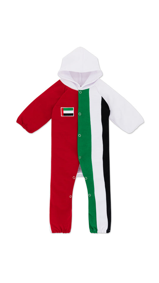 A straight-cut unisex romper featuring a hoodie-style neck and full-length sleeves. It showcases a UAE flag-shaped pattern, expertly crafted using fabric in the flag's signature colors. The front is designed with a full buttons for convenient wear, while both the sleeves and foot holes are equipped with elastic for a comfortable fit.• Style: Straight cut Romper