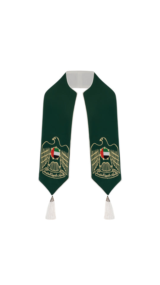 National day shawl for kids. It has an attractive and elegant design on both sides, designed with elegant white pipping and on the front from the bottom with the emblem of the UAE falcon in beautiful gold color with a circle inside the falcon in bright flag colors. The bottom of the shawl is a white machine fez with the color of the piping striking beauty.
