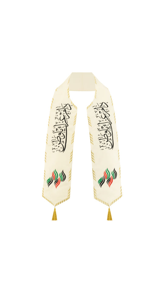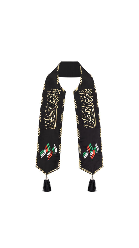 National day shawl made of luxurious bridal fabric with a sophisticated and unique design. It is embroidered on both sides with attractive golden prism thread and embroidery on the front in black with the phrase (Damma Azak Ya Watan). With embroidery at the bottom of the shawl in the bright colors of the flag with a golden fez, it added a wonderful artistic touch to the shawl.