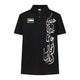 A sleek and classic black t-shirt featuring a collar neck and comfortable half sleeves. This t-shirt is adorned with an elegant silver-colored Arabic calligraphy embroidery on one side, adding a touch of sophistication. On the other side, it proudly displays the UAE flag, combining style and national pride seamlessly. Crafted from Dri-Fit fabric, this shirt ensures comfort and moisture-wicking properties for a perfect blend of fashion and functionality.