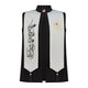 A sleek, straight-cut open waistcoat, with a distinctive band collar neck. This plain waistcoat is adorned with a pocket on the upper front, elegantly complemented by a fixed shawl detail extending from the shoulder with a black tarboosh. On one side, there's an intricate falcon embroidery, while the other side features beautifully embroidered Arabic letters, adding a touch of cultural flair to the ensemble.