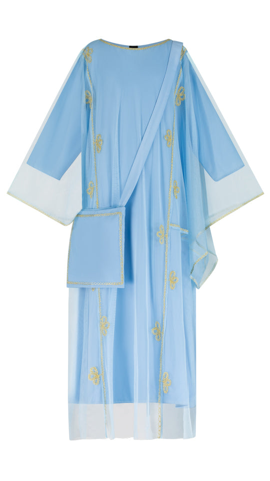 - Detail: Attached cape with the dress, embellished with zari work on the neck and the borders of the cape with a flower pattern