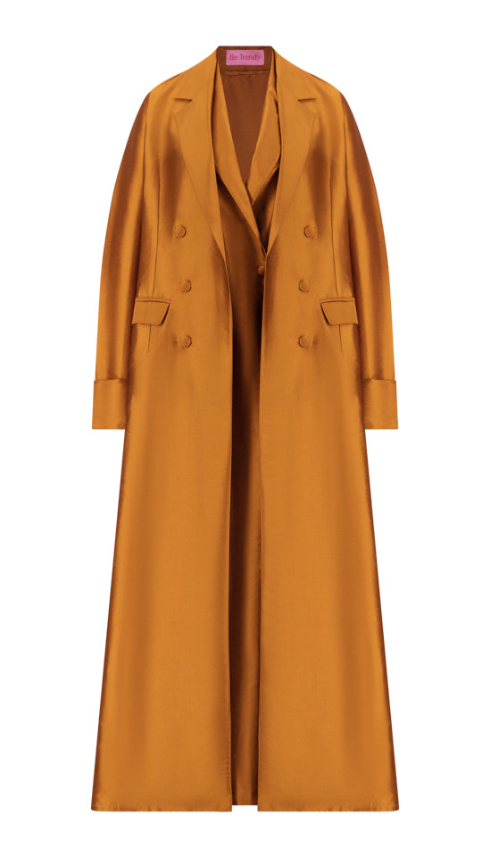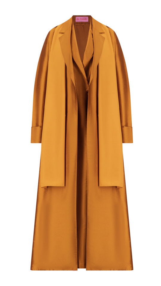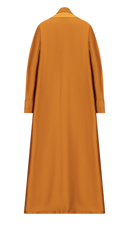 An A-line long abaya that exudes timeless elegance and sophistication. This exquisite abaya features a double coat collar and a graceful V-shaped neckline, epitomizing classic style. The long sleeves are meticulously designed with a fold at the bottom, adding a touch of refinement to the silhouette. Crafted from luxurious silk taffeta fabric, it offers both opulence and comfort, ensuring you feel regal and at ease simultaneously. The abaya's distinguishing feature is its double front design, with each front adorned by six tasteful buttons, enhancing its polished appearance. On both sides, flap pockets provide both functionality and a fashionable touch. This abaya is a true symbol of refined grace and fashion-forward design, making it the perfect choice for formal gatherings and special occasions where sophistication is paramount.