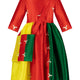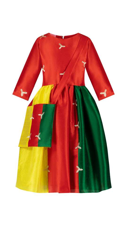 A princess-seamed body cut dress is a tailored garment that fits closely to the body, emphasizing the curves of the wearer. The dress is embellished with machine embroidery all over, adding a touch of elegance and texture to the dress. The three-colored pattern on the dress makes it stand out, creating a sophisticated and dressy look.