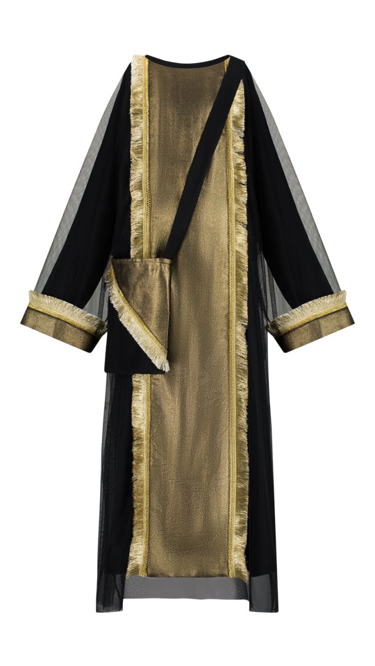 Adorn yourself in elegance with this captivating dress featuring a round neckline that exudes timeless charm. The dress is adorned with a tulle front border embellished with whimsical tussles lace, adding a touch of sophistication to the ensemble. The same tussles lace graces the tops of the sleeves, creating a cohesive and enchanting look. Crafted from a luxurious blend of Almas, airy tulle, and sleek synthetic fabric, this dress is a harmonious fusion of comfort and style, perfect for any special occasion.