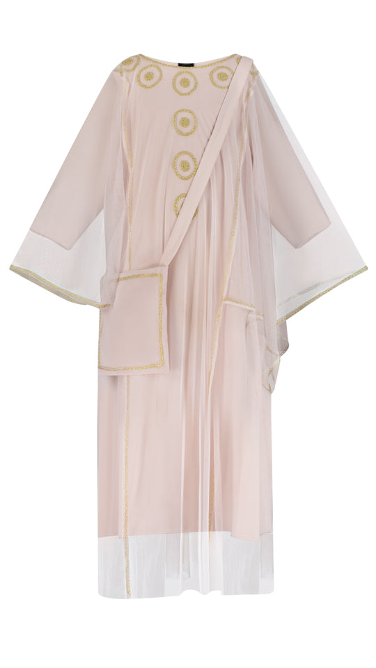 - Detail: Attached cape with the dress, is embellished with zari work on the neck, the borders of the cape with a flower pattern, and the chest is embellished with circle zari work.