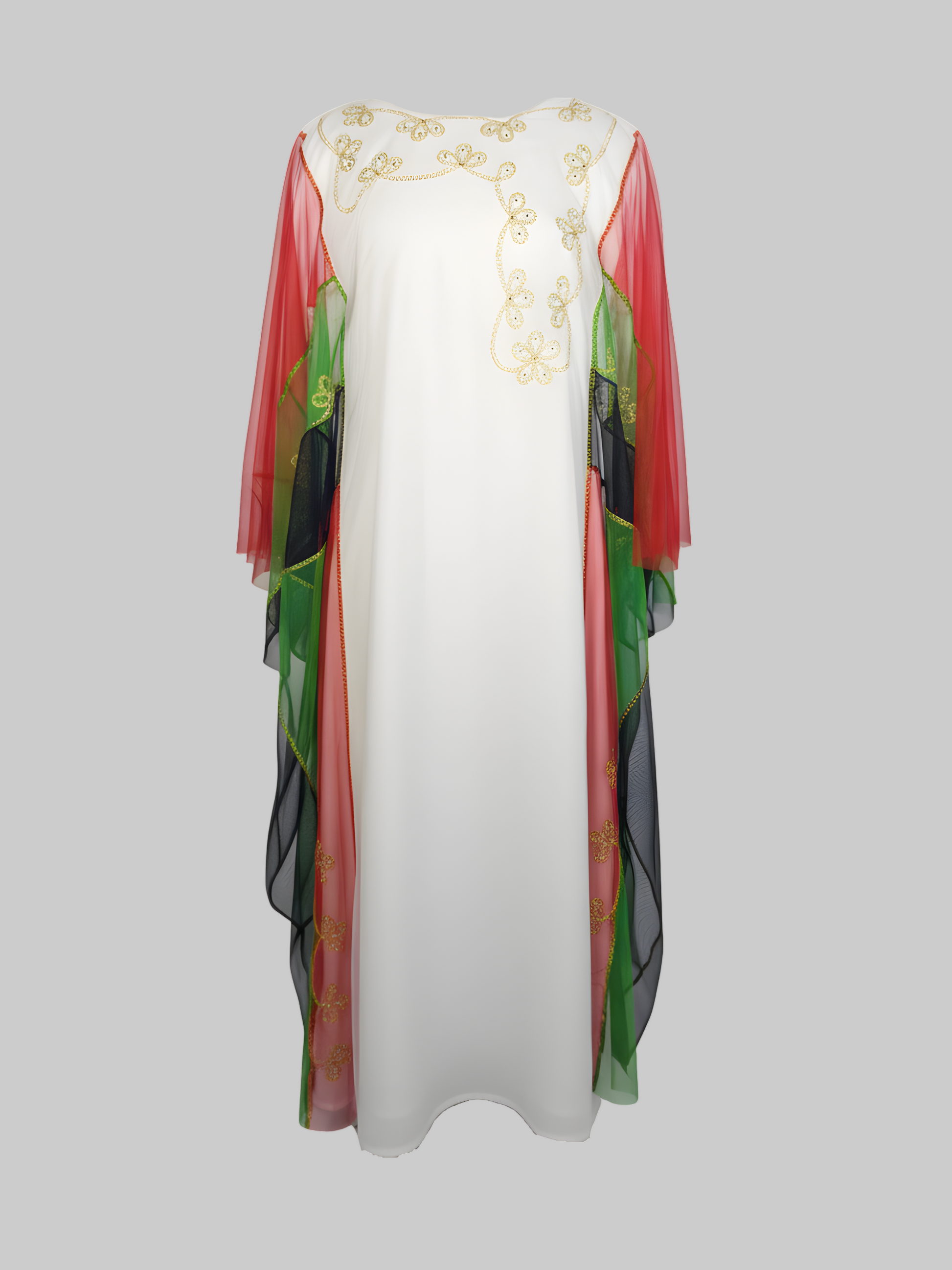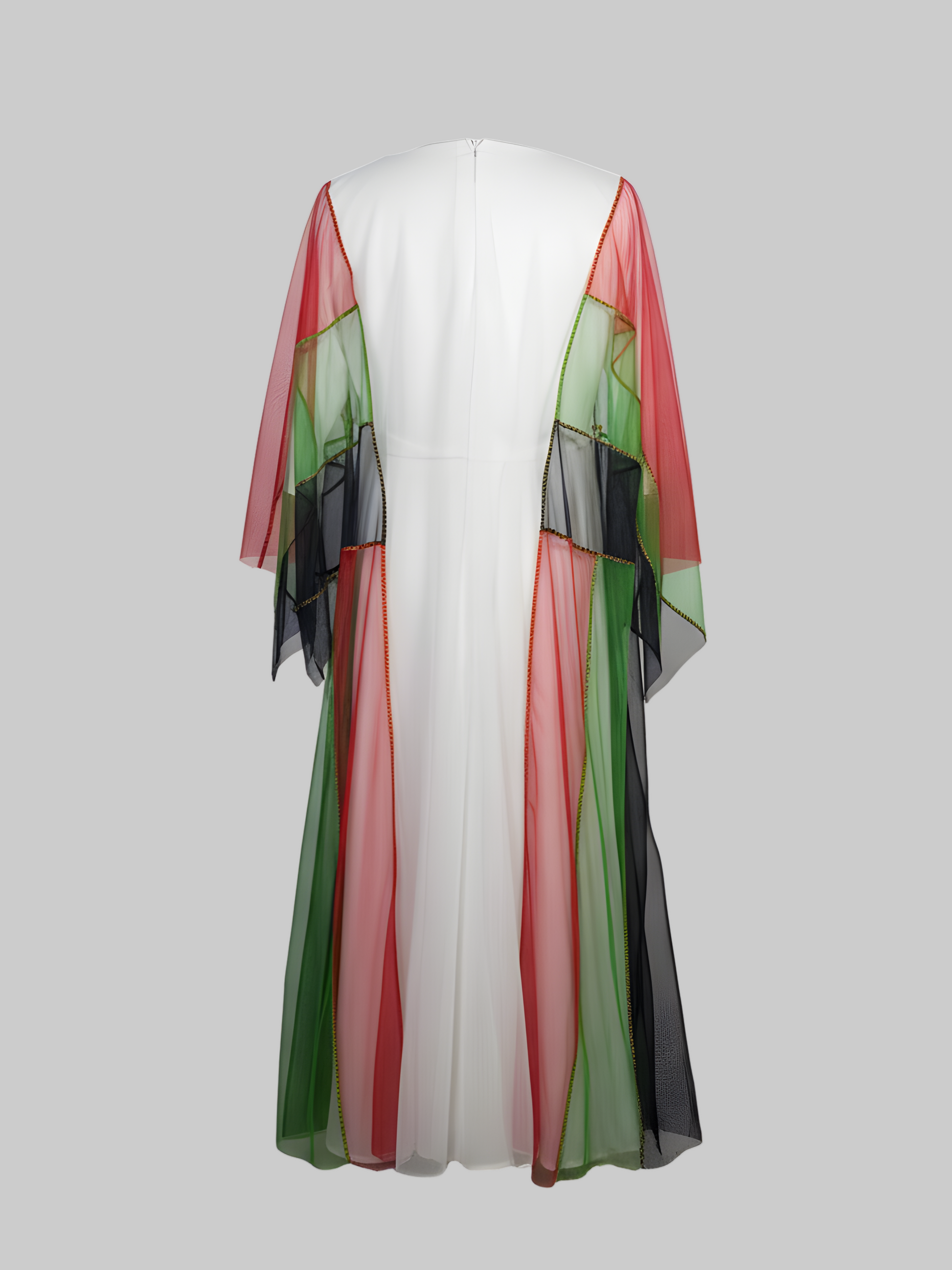 A sophisticated long A-line dress designed with a round neckline and elegant 3/4 sleeves. The dress features an attached cape beautifully