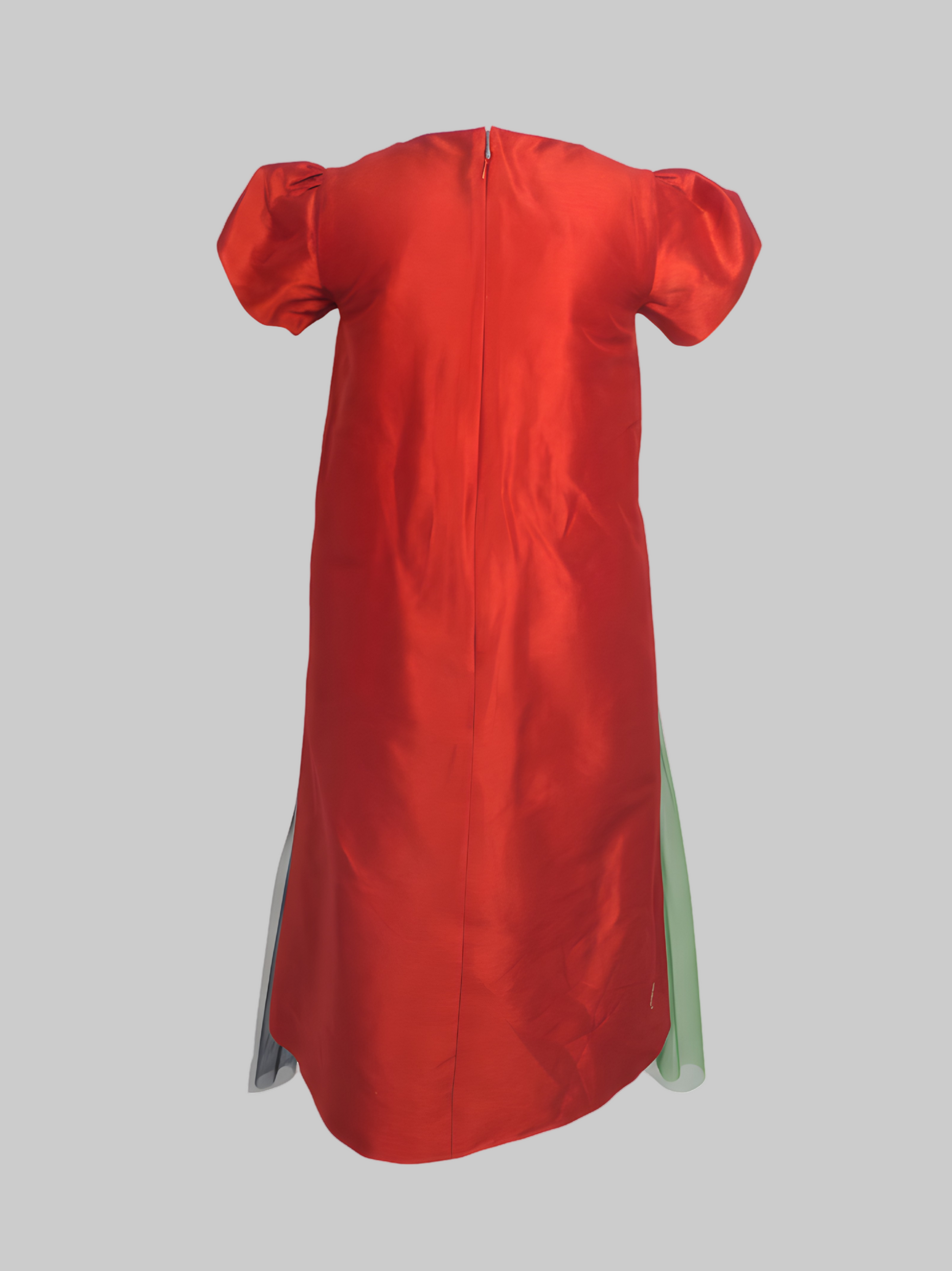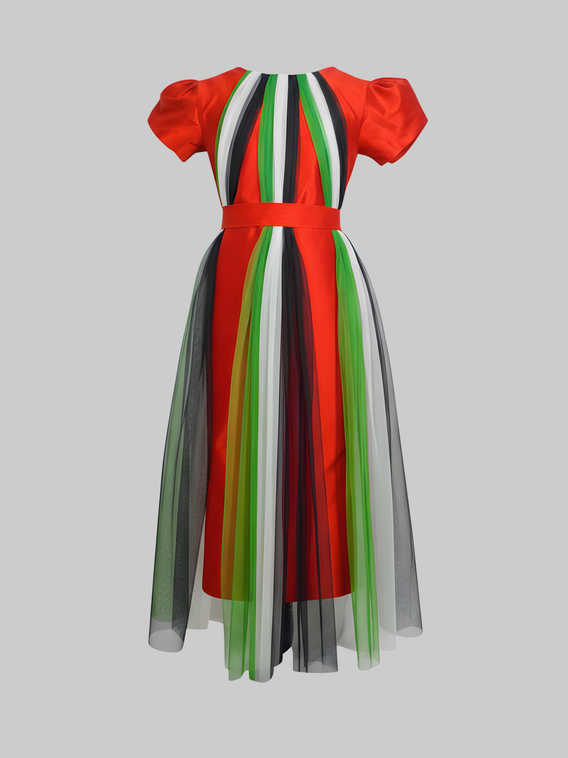 A refined A-line long dress featuring a round neckline and half sleeves. The design showcases elegant tulle gathering attached from the