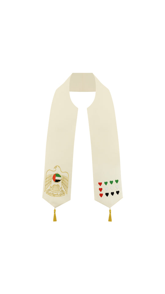 A 58-inch girls' shawl exquisitely crafted from bridal satin fabric. On one side, it features an embroidered golden falcon, symbolizing pride and strength, while the other side showcases delicate small hearts arranged in a flag shape with a golden outline, representing love and patriotism. Adding a regal touch, both ends of the shawl are adorned with golden tarboush motifs, creating a truly elegant and meaningful accessory.