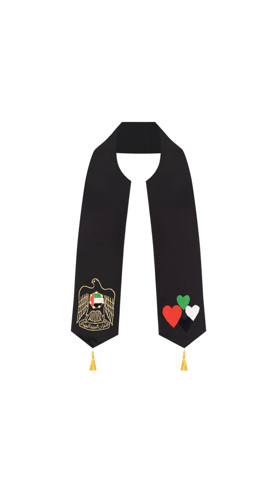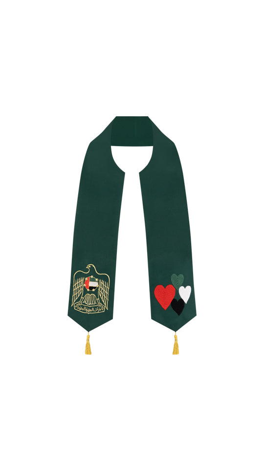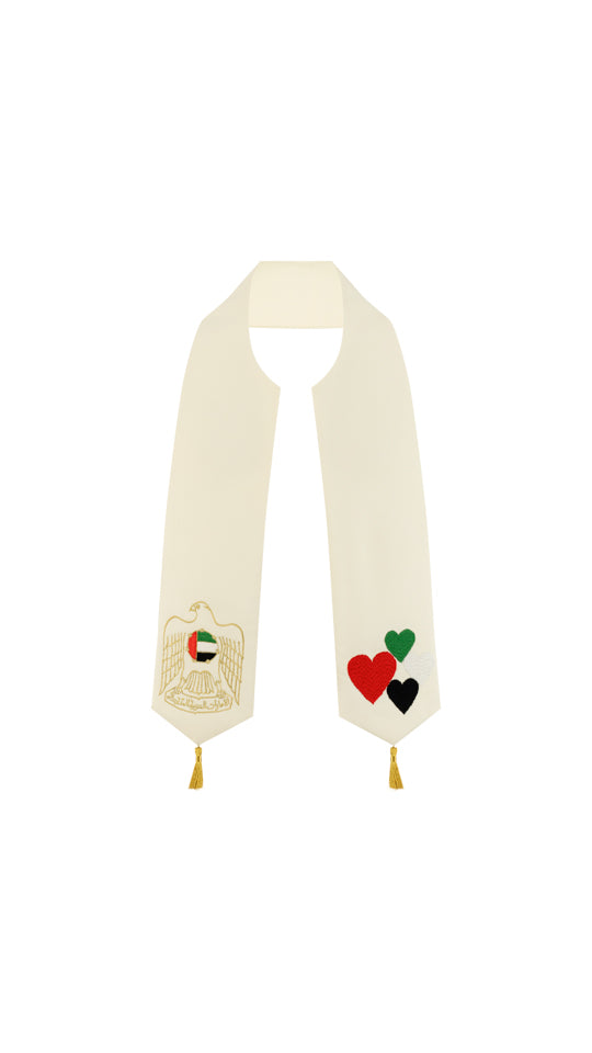 A 58-inch length girls' shawl featuring intricate details: one end showcases an elegantly embroidered falcon, while the other end is adorned with four hearts embroidered in the colors of the UAE flag. The pointed triangular section is embellished with golden tarboosh motifs on each end. Crafted from luxurious bridal satin fabric, this shawl combines sophistication and national pride in a beautifully designed accessory.