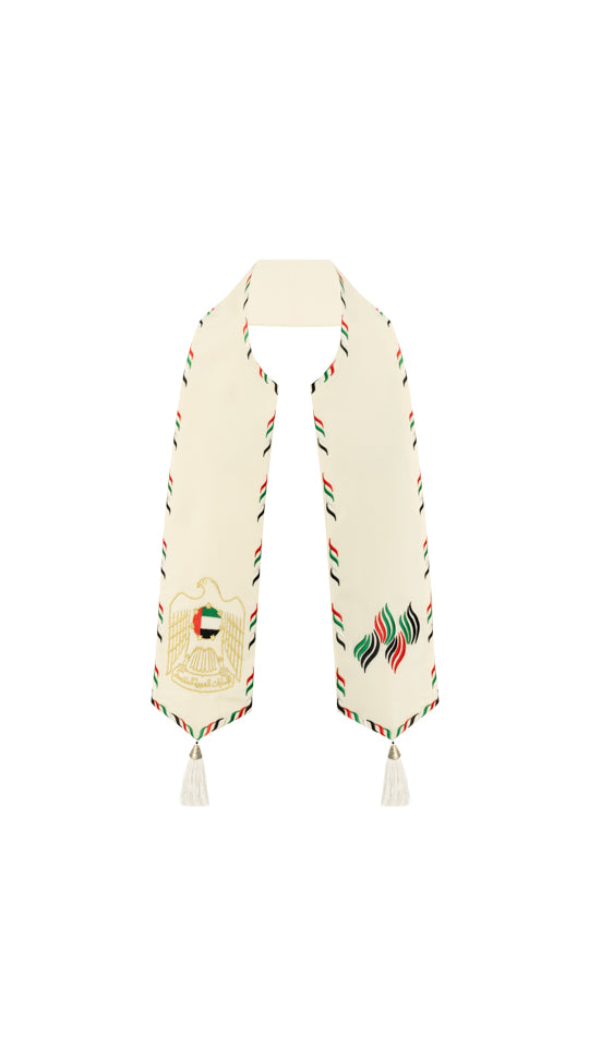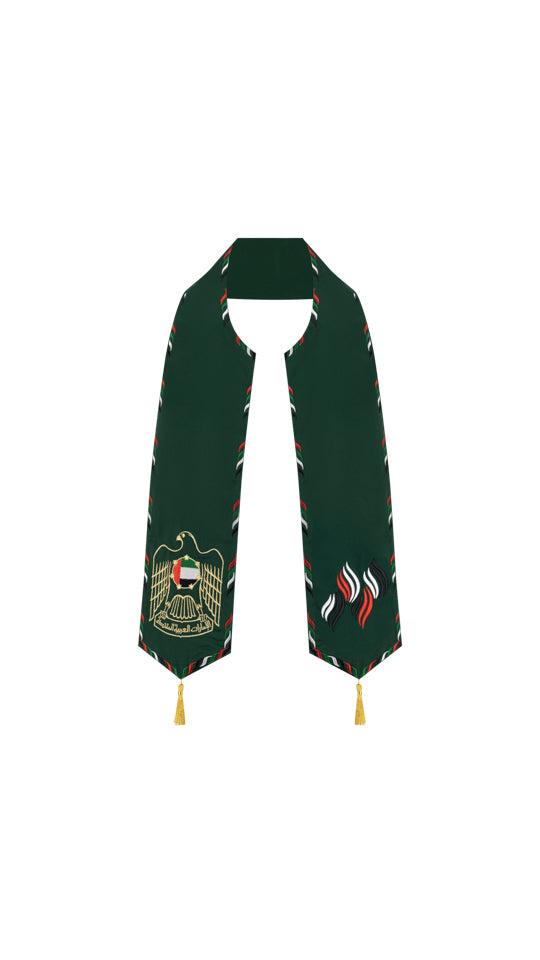National day shawl made of fine bridal fabric, beautifully designed, embroidered on the sides of the shawl in bright flag colors and from the bottom of the front embroidered with the state emblem of the falcon in golden color and on the middle of the falcon a golden circle in the beautiful colors of the flag. The other side is embroidered in the attractive colors of the flag with an elegant fez at the bottom of the shawl.