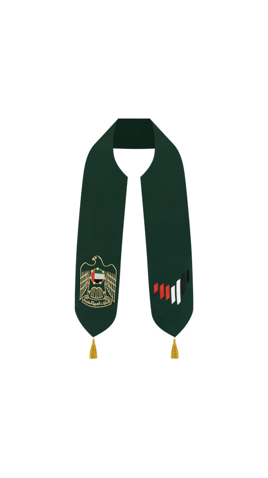 The national day shawl is made of elegant bridal fabric with a unique and beautiful design that highlights the skill and creativity in the design. The two sides of the shawl are organized with elegant piping. One side of the shawl is carefully embroidered with the bright colors of the flag and another side is the state emblem of the falcon in an attractive gold color with a circle of flag colors in the middle of the falcon in a refined artistic way.