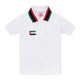 A classic white polo-style t-shirt with a collared neck and comfortable half sleeves. The collar is adorned with UAE flag-colored stripes running from one side to the other, adding a stylish and patriotic touch. On the right front of the t-shirt, the UAE flag is elegantly embellished. Crafted from Dri-Fit material, this shirt combines comfort and performance, making it a fashionable and functional choice for any occasion.