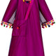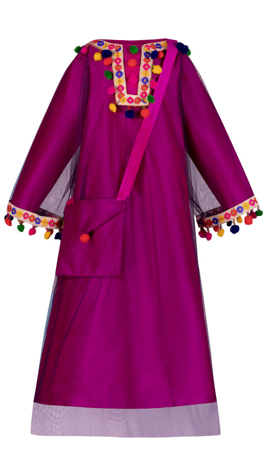 Make a regal entrance in this exquisite A-line long dress featuring a timeless round neckline and elegant full-length sleeves. The dress exudes simplicity with its plain design, allowing its beauty to shine through. Accompanying this dress is a separate tulle cape, adding an extra layer of sophistication to your ensemble. The cape is adorned with charming pompom lace detailing along the neck and sleeve borders, enhancing its allure. Crafted from luxurious Shanja and tulle fabric, this ensemble exudes refinement and grace. Complete your look effortlessly with the included separate matching bag, perfect for any special occasion.
