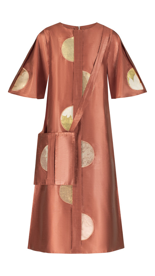 The raw silk material and the jacquard patch suggest that it is a high-quality and visually interesting dress that would stand out in a crowd. There is a single pleat on the center of the dress, possibly on the front, which adds some visual interest and dimension to the garment. The dress has a half-circle patch made of jacquard fabric, this sounds like a simple yet elegant dress that would be suitable for a variety of occasions.