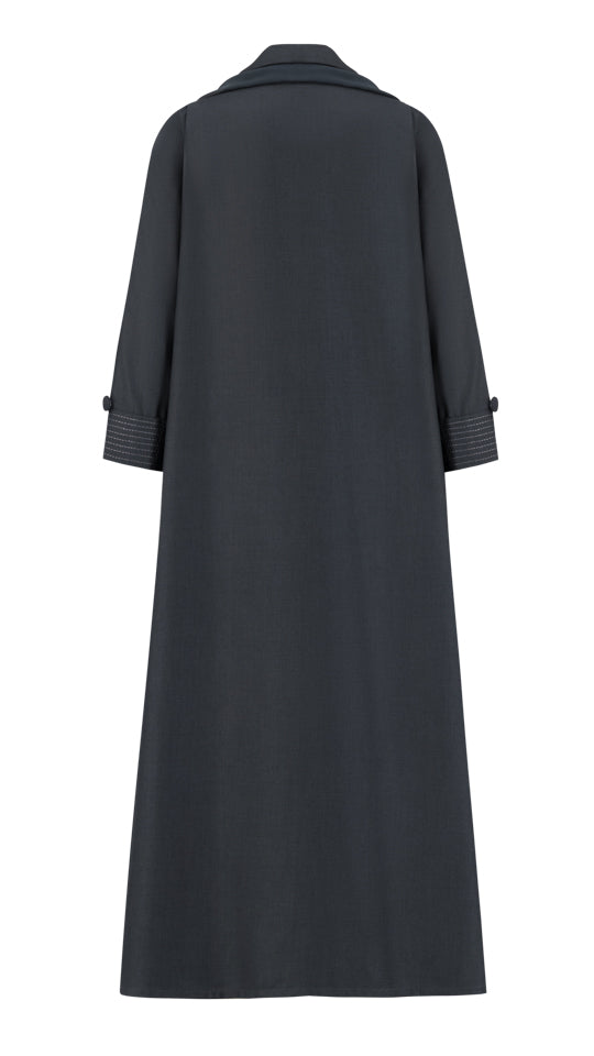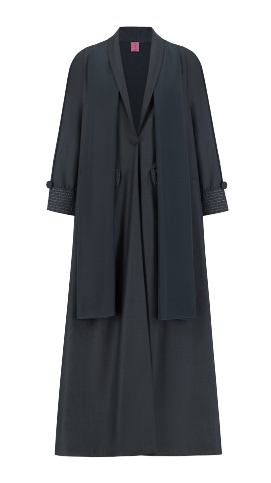 Introducing our exquisite A-line long abaya ensemble, a harmonious fusion of modest elegance and contemporary design. This stunning outfit features a meticulously crafted abaya, complete with a V-shaped neck that exudes sophistication. The inner top boasts a distinctive coat-style V-shaped collar neck, adding a touch of refinement to your look. The abaya comes with full-length sleeves, offering both comfort and style. What sets this ensemble apart is the exquisite detailing – dori piping adorns the front of the abaya from the shoulder down to the waist, creating a subtle yet striking visual appeal. The same piping extends gracefully along the sleeves, adding a cohesive and eye-catching element. To further enhance its charm, the abaya boasts flap pockets on both sides, meticulously decorated with delicate rayon thread embroidery. This intricate embroidery is also present on the sleeves' cuffs, elevating the ensemble's overall aesthetic. The cuffs are adorned with buttons in the middle, adding a dash of uniqueness and charm. Beneath this graceful abaya, you'll find straight-cut pants designed for both comfort and style. The use of bliss fabric ensures a luxurious feel against your skin, making you not only look elegant but feel truly confident in this ensemble. With its thoughtful design and impeccable craftsmanship, our A-line long abaya with a top and trousers is the epitome of refined fashion for those who appreciate the beauty of modest attire with a modern twist.