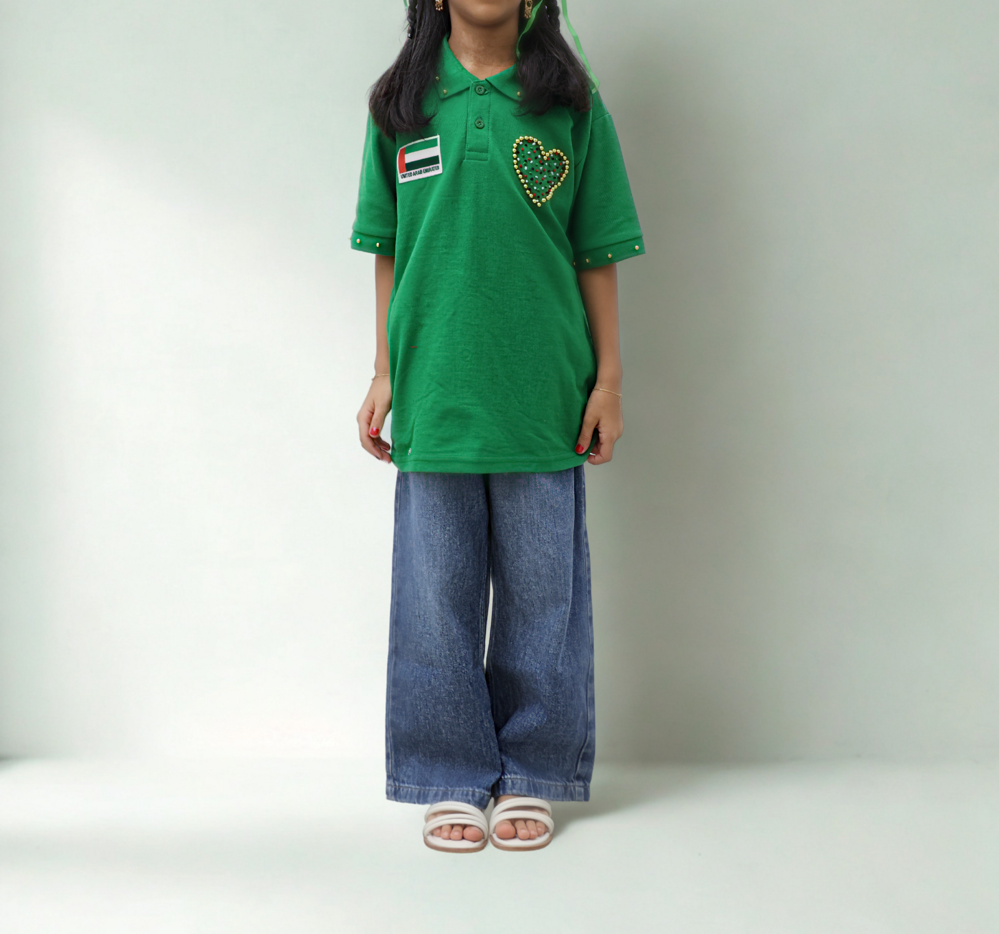 four vertical lines adorned with rainbow crystals, adding a subtle sparkle to the minimalist design. The left side highlights a UAE flag motif,