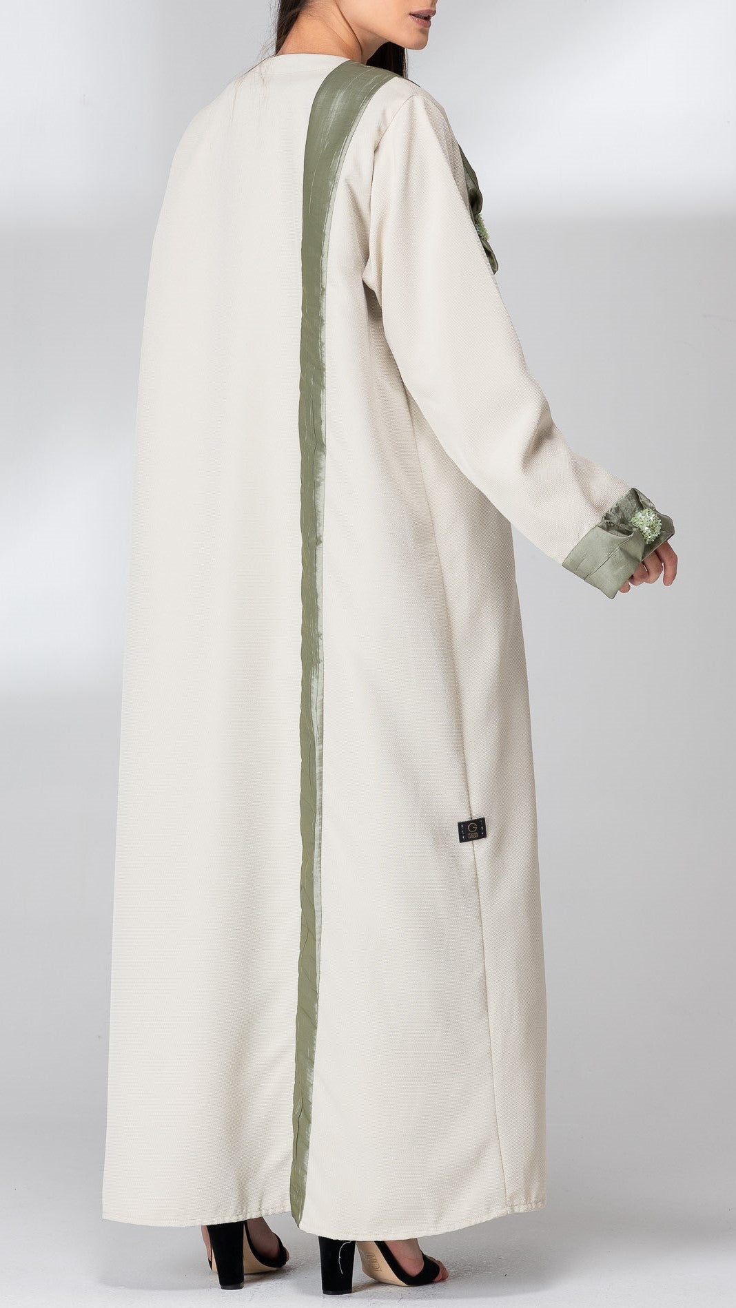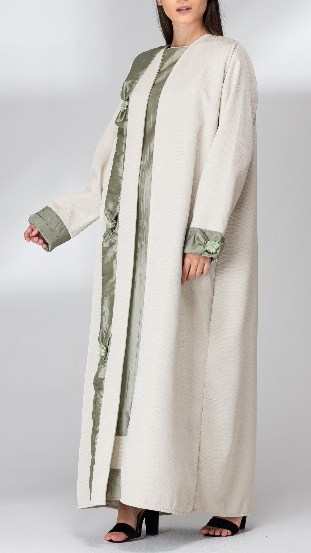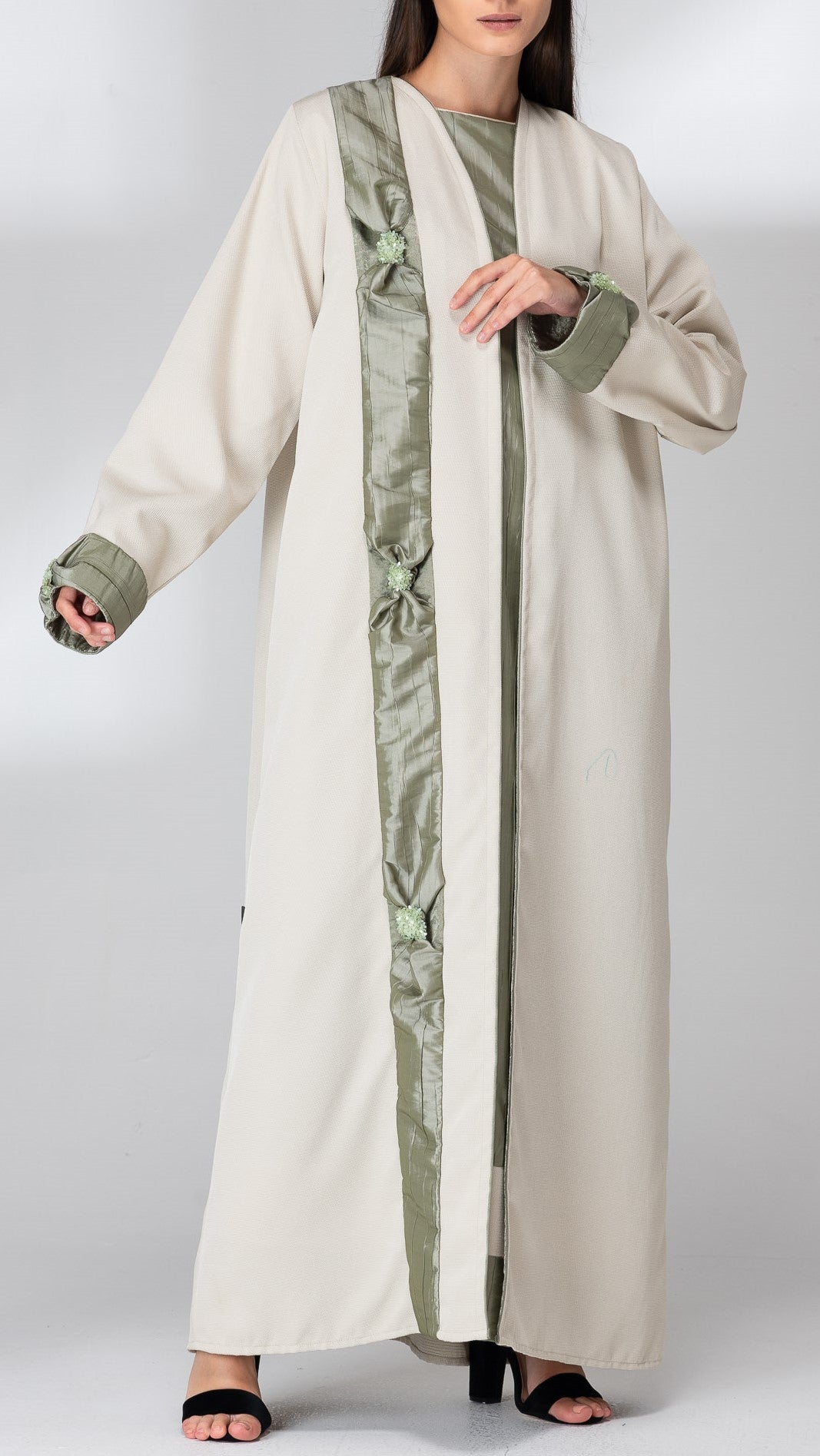 Luxurious linen fabric abaya decorated with SK crush crape fabric with bows knotted on both sides of the abaya, reflecting the captivating beauty of the abaya. Suitable for dreamy winter weather.
