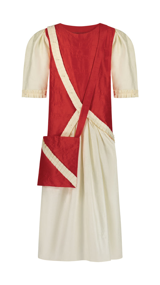 Elevate your style with this sophisticated A-line long dress, featuring a timeless round neckline and chic half sleeves. The sleeves are adorned with delicate gathering at the shoulders and pleating along the border for added elegance. Embellished with intricate pleating on the front, and accented with lulu detailing at the top, this dress exudes refined charm. Crafted from luxurious Shanjha fabric, it offers both comfort and luxury. Complete your ensemble effortlessly with the included matching crossbody bag for a coordinated look.