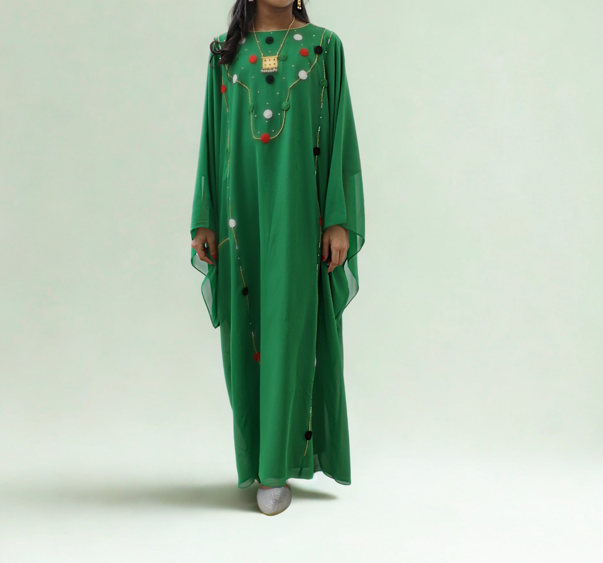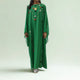 An elegant A-line long dress featuring a classic round neckline and 3/4 sleeves. The design is enhanced with an attached cape that gracefully