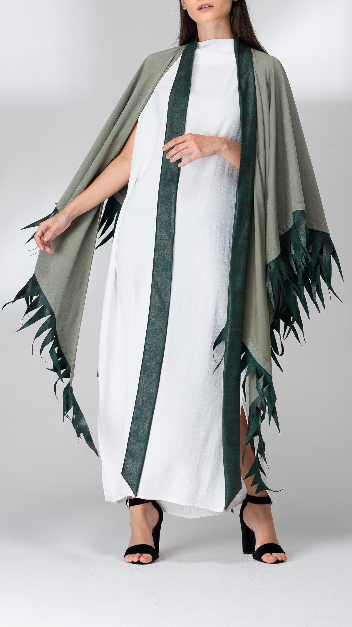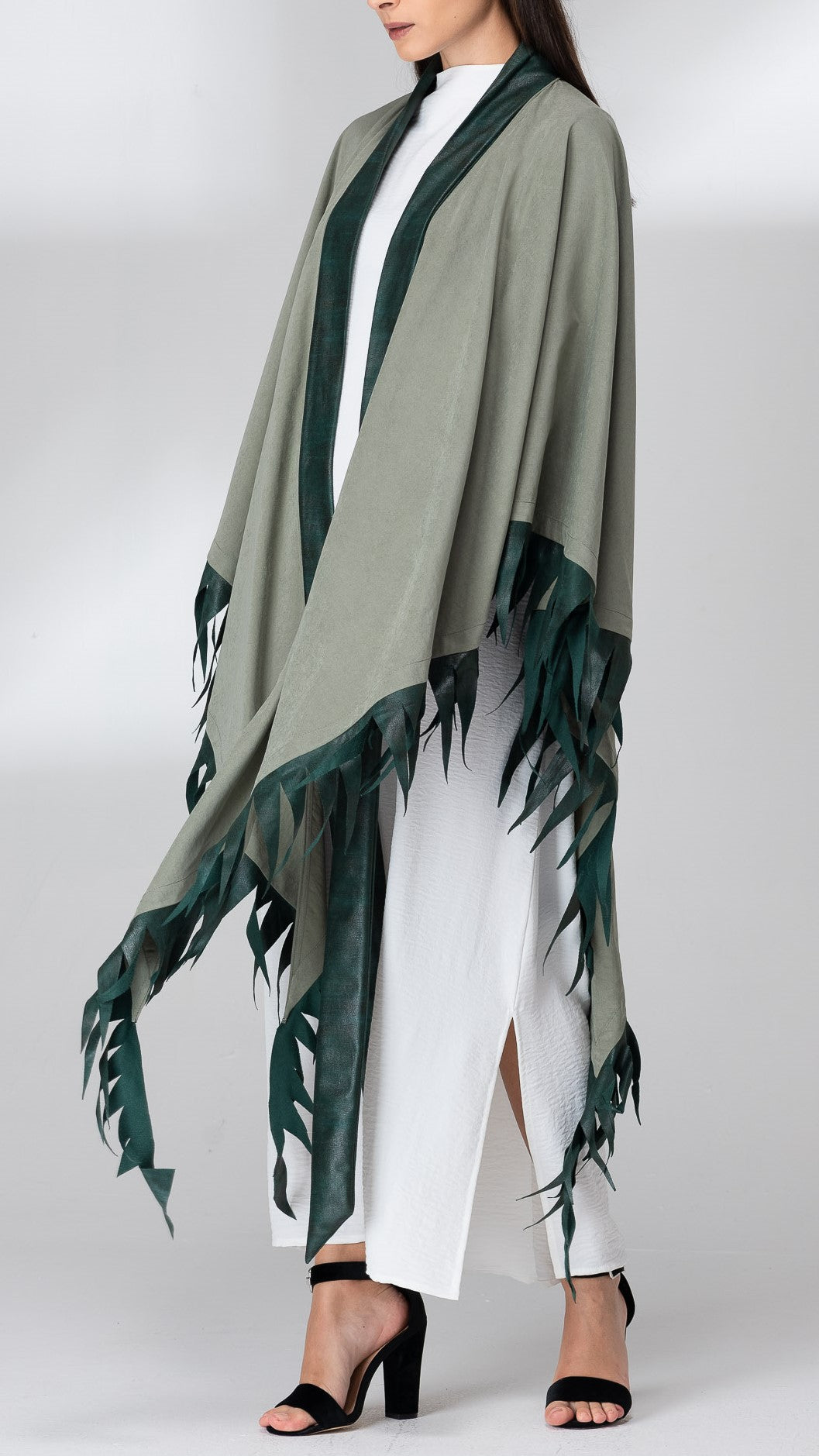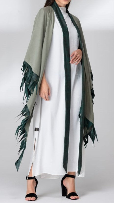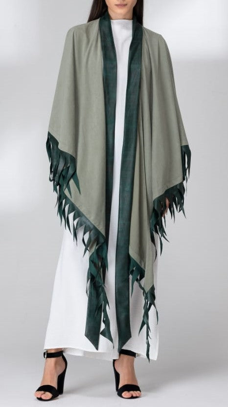 Luxurious chamois abaya with elegant leather straps in the shape of a Mexican countryside design. The abaya is in the form of a long, drop-down shawl with a wonderful inner dress and a long leather band that falls from the top of the neck to the end of the dress. Suitable for cold evenings.