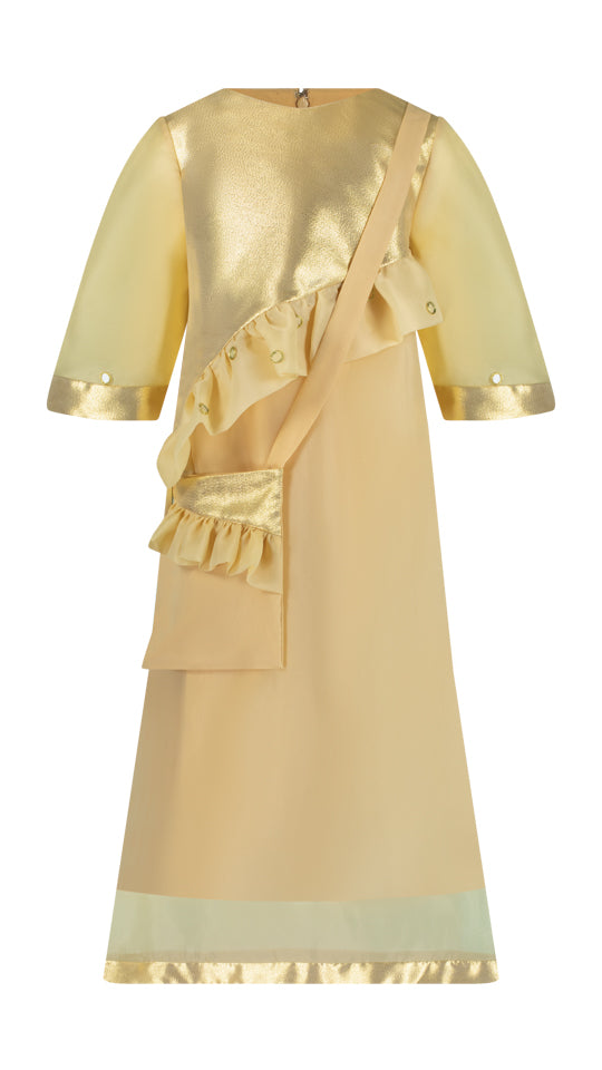 A-line organza and jacquard dress with round neck and quarter sleeves. Beautifully attached jacquard on the upper body of the dress followed by a crossed organza frill. Jacquard detailing on the edges of the sleeves and bottom of the dress make it perfect. Dress and the bag both have beautiful mirror work.