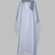 This A-line long dress features a sleek and minimalist design, enhanced by a fixed cape that drapes elegantly over the shoulders. The dress has a square-shaped neckline and 3/4 length sleeves, offering a modern yet timeless silhouette. Crafted from delicate tulle fabric, the dress has an ethereal quality. The fixed cape is the focal point of the design, embellished with four square-shaped piping that add structure and visual interest. Intricate zari embroidery adorns the top of the cape, providing a touch of shimmering detail that elevates the overall look, perfect for a sophisticated and stylish appearance.