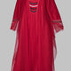 This A-line long dress is elegantly designed with a fixed cape, adding a dramatic and sophisticated touch. The round-shaped neckline and 3/4 length sleeves are complemented by curved piping that adorns both the dress and the cape, providing a refined, cohesive look. Crafted from luxurious Shanja and delicate tulle fabrics, the dress drapes gracefully, while the cape offers a flowing, ethereal quality. This combination creates a stunning silhouette perfect for any special occasion.