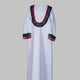 • Detail: The dress design with six curved piping on the front with zari embroidery, the same piping details on the sleeves cuffs, one shoulder with a chic bow