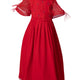 National day dress. Made of luxurious soft tulle fabric of the elegant and attractive red color. The design is elegant and wonderful in the center in the form of ruffles with a beautifully designed belt in harmony with the same shape on the borders of the neck. The sleeves are designed in the form of a cloche. The chest and sleeves are decorated with luxurious soft feathers and luxurious beads in the colors of the flag, the pinnacle of beauty and sophistication.