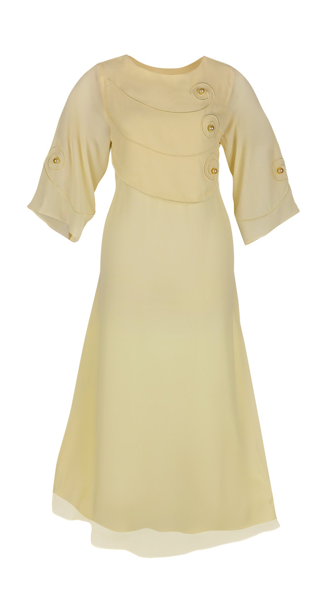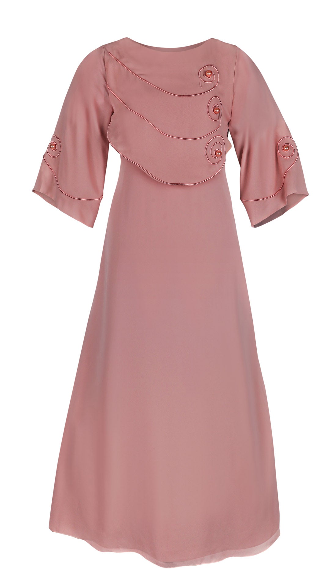 This elegant A-line long Jalabiya features a classic round-shaped neckline and 3/4 cloche-length sleeves, creating a graceful and flattering silhouette. The Jalabiya design is enhanced with an additional curved layer on the front, adding dimension and flow to the piece. It is beautifully embellished with intricate machine embroidery and delicate pearls, which adorn the front and the sleeves for a luxurious finish. Crafted from lightweight chiffon fabric, this Jalabiya exudes refinement and is perfect for formal events or special occasions, combining traditional charm with modern elegance.
