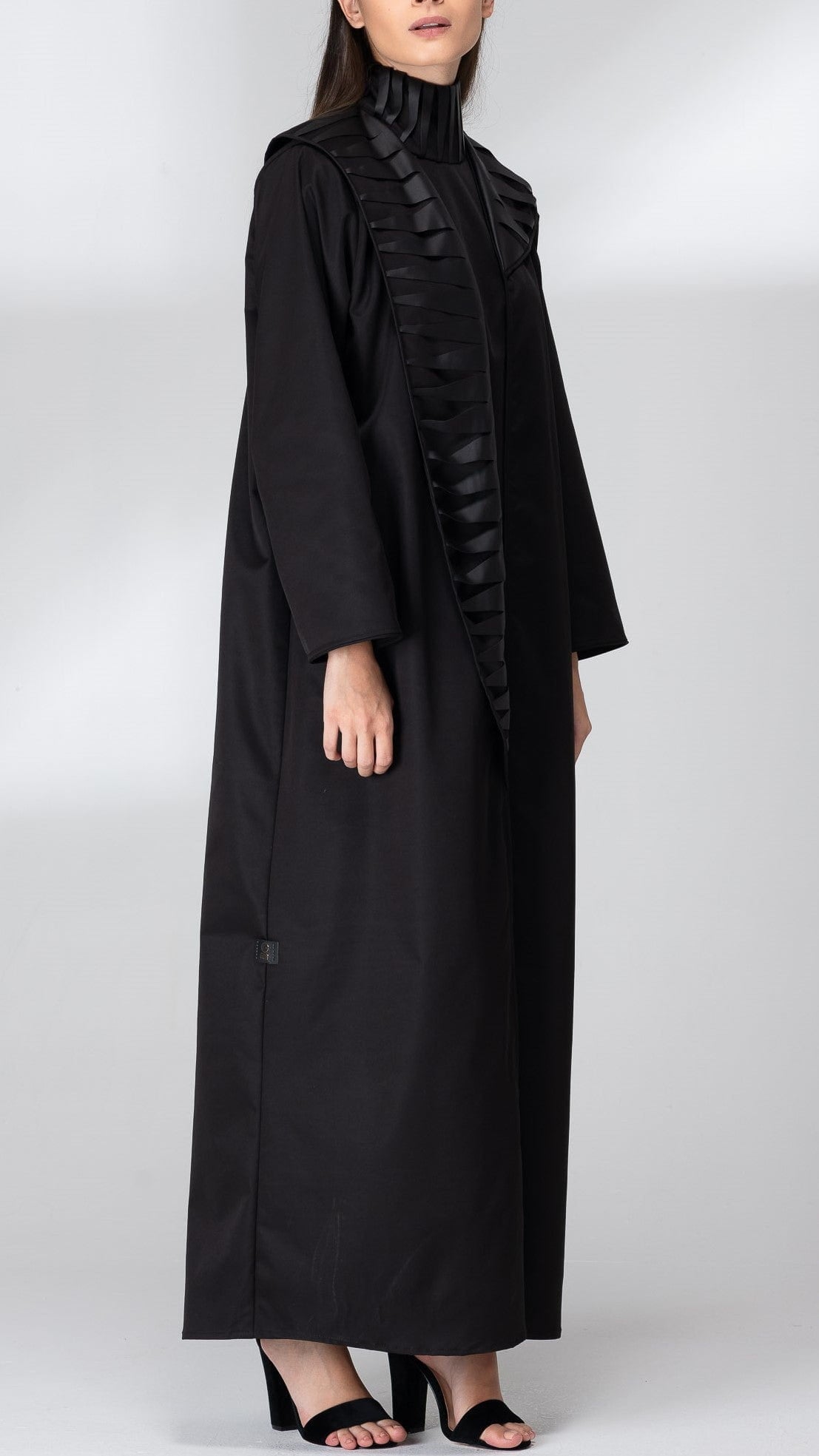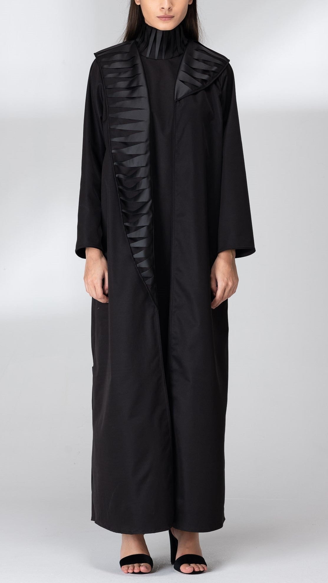 Attractive and soft black abaya, with scissors leather around the neck till front in Question mark shape, shining fabric give magically feature. Suitable for winter and cold spring days.