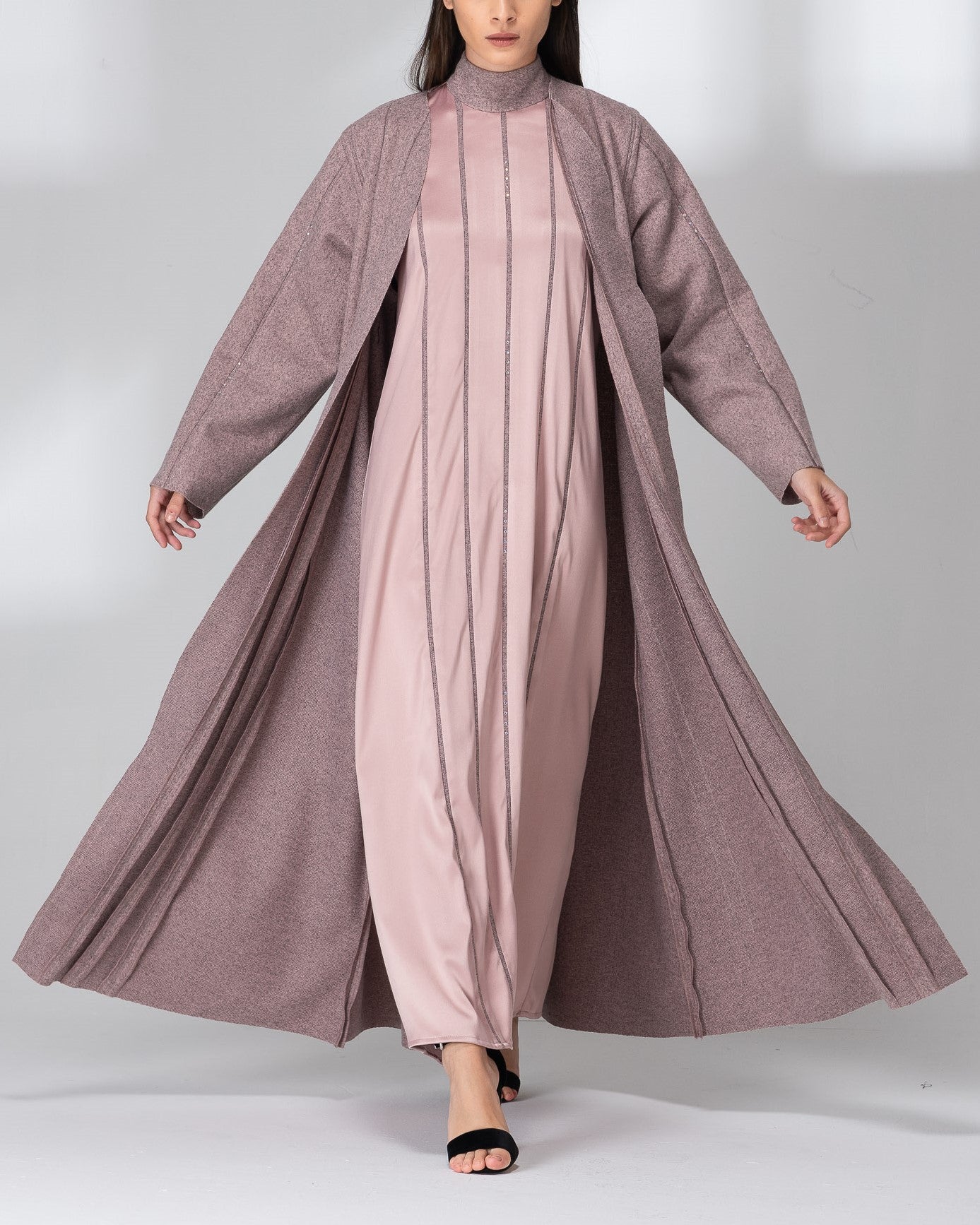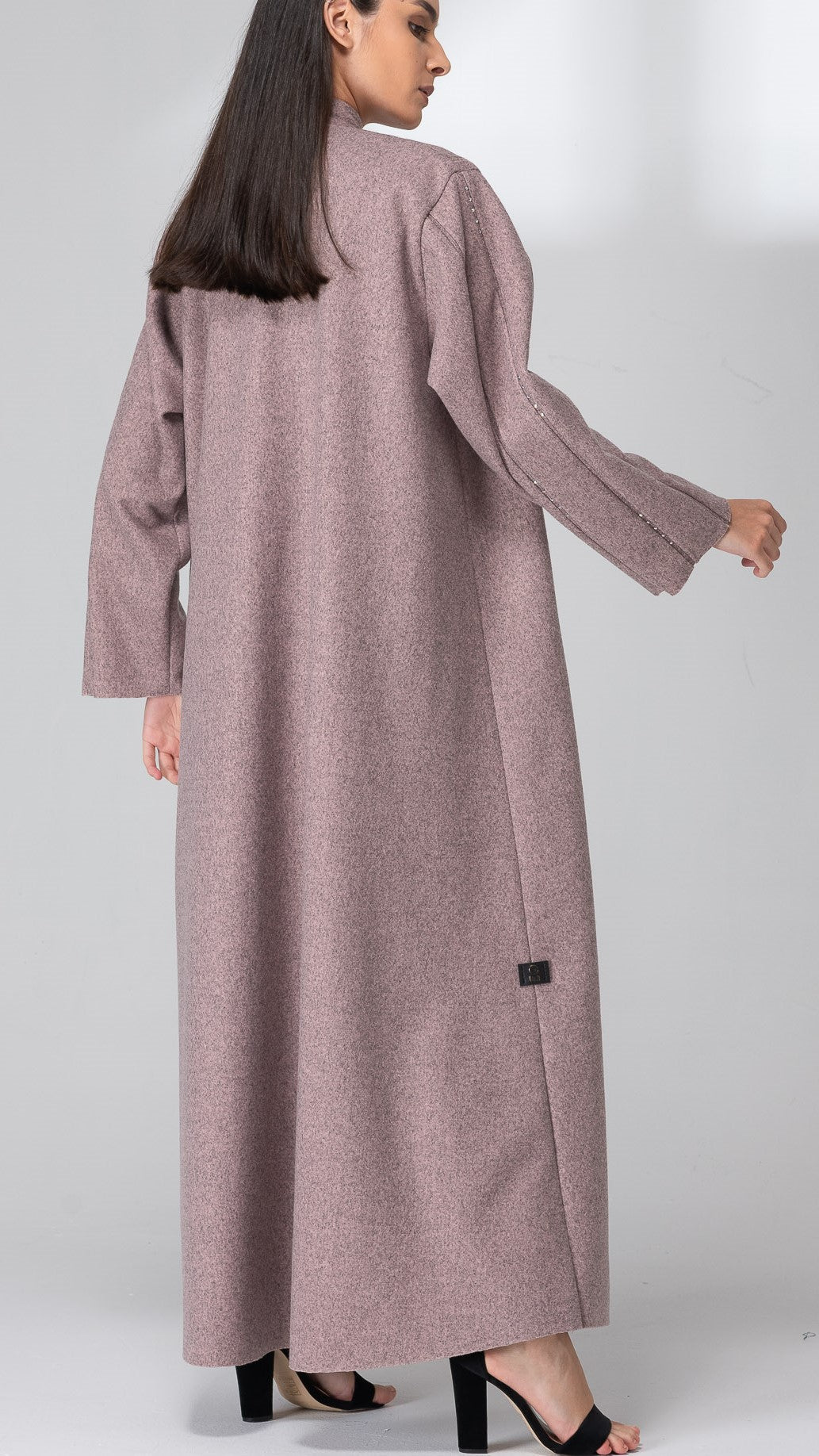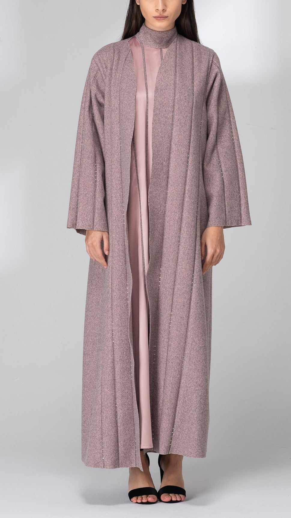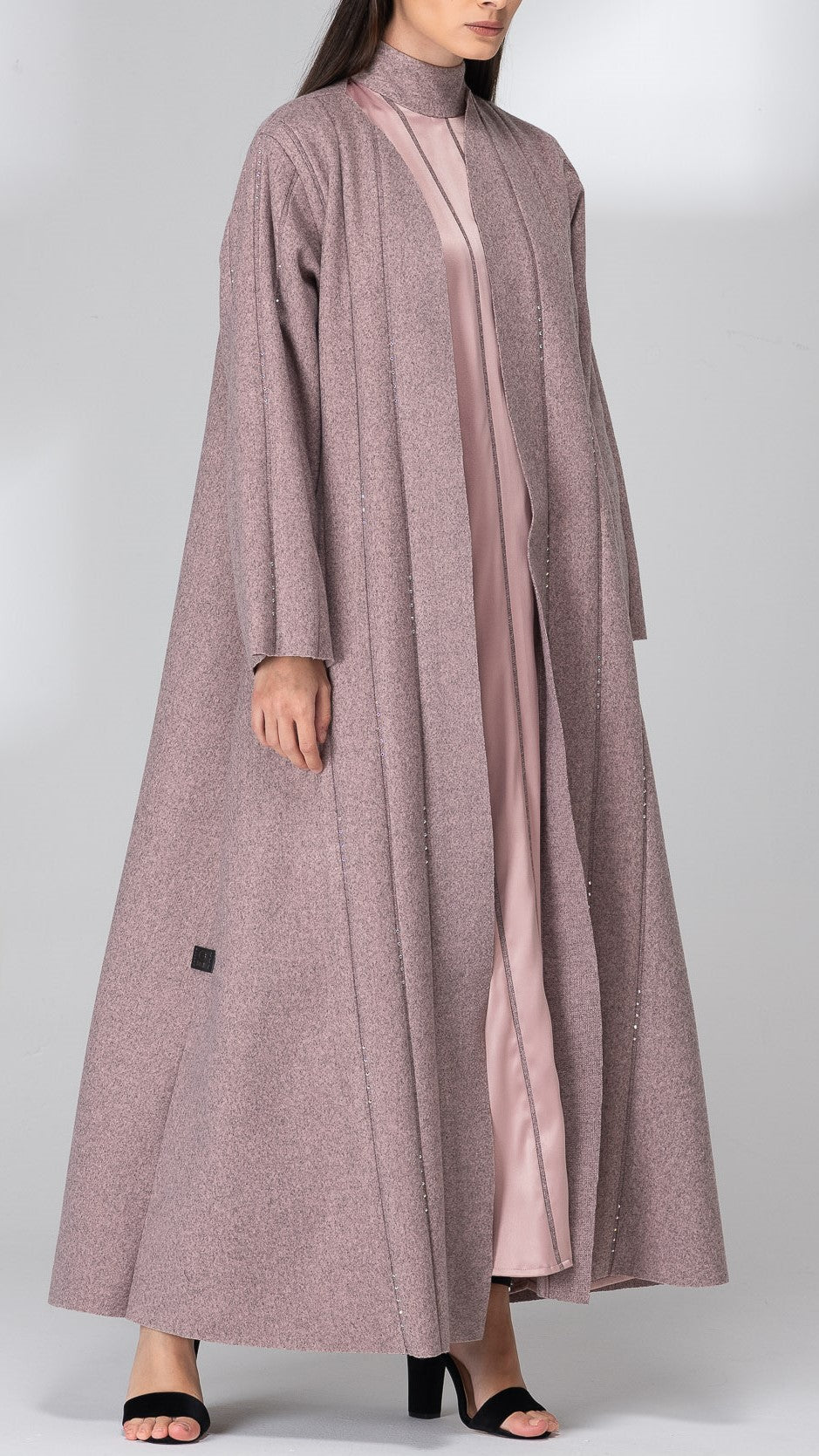 Full abaya with front straight lines embellished by rainbow crystals. Charming, comfortable, and Suitable for cold season and spring.