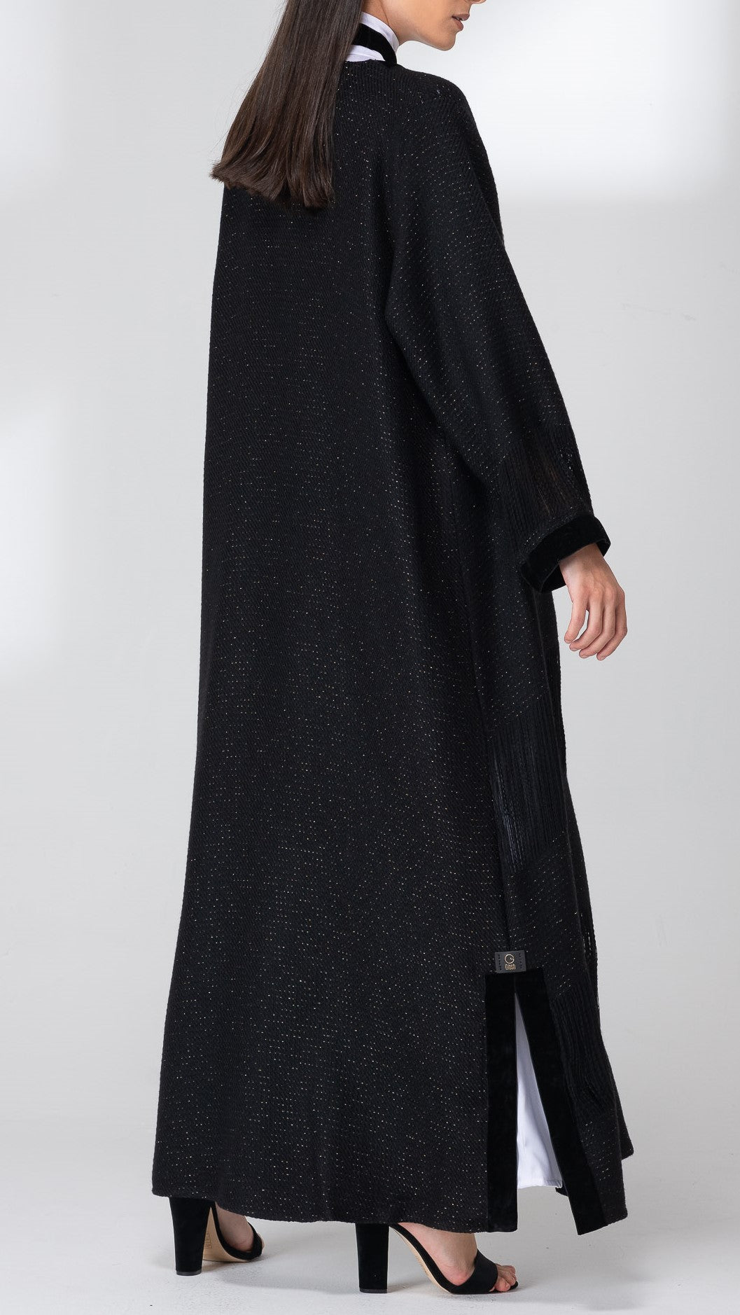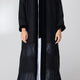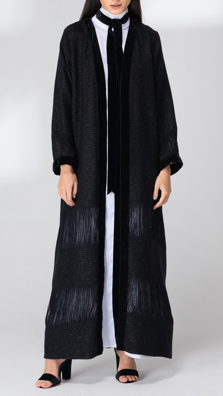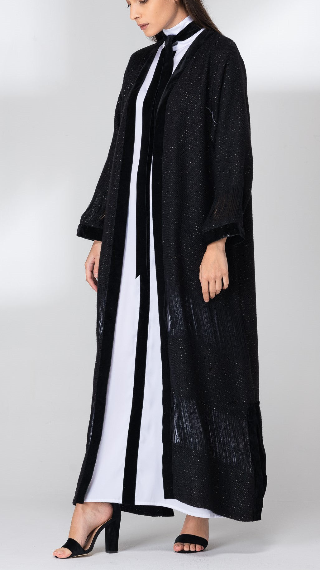 An abaya with an attractive design, the fashion of white inner dress, and black abaya color. With threads at the bottom of the abaya and a sophisticated black tie at the top of the inner dress. Suitable for cold mornings and evening as well.