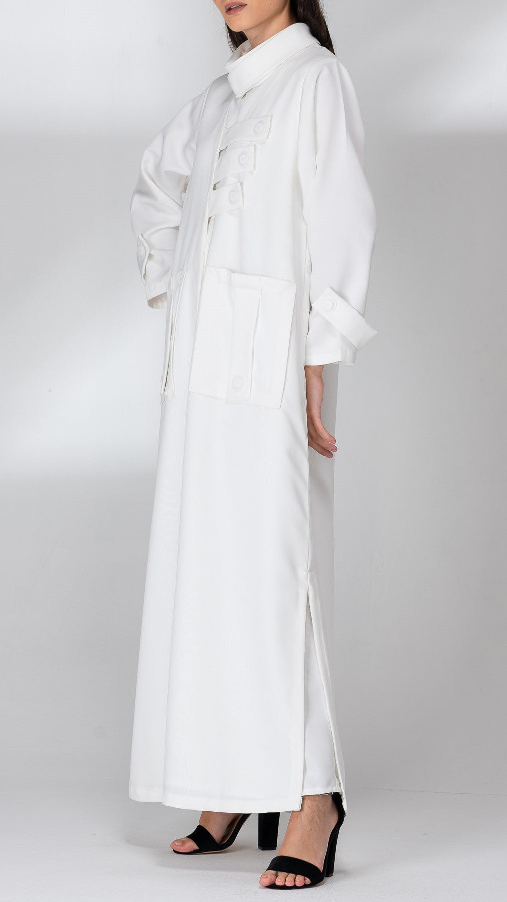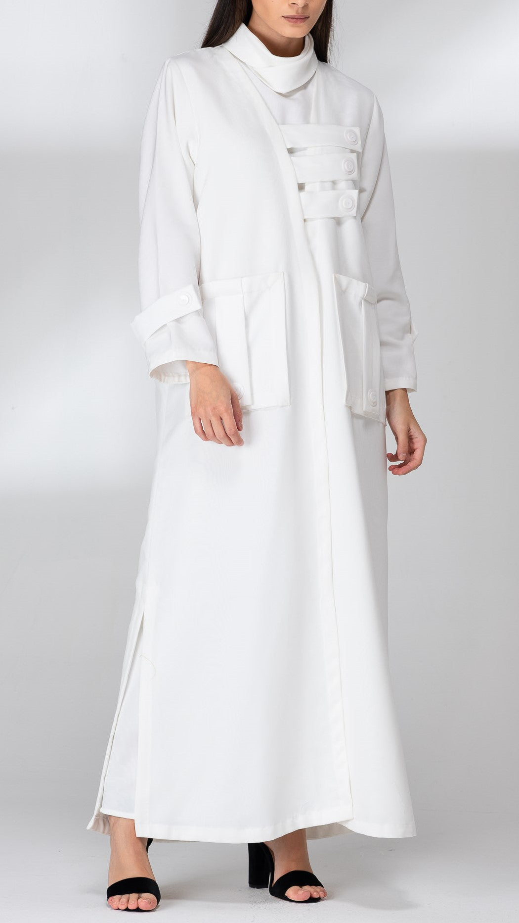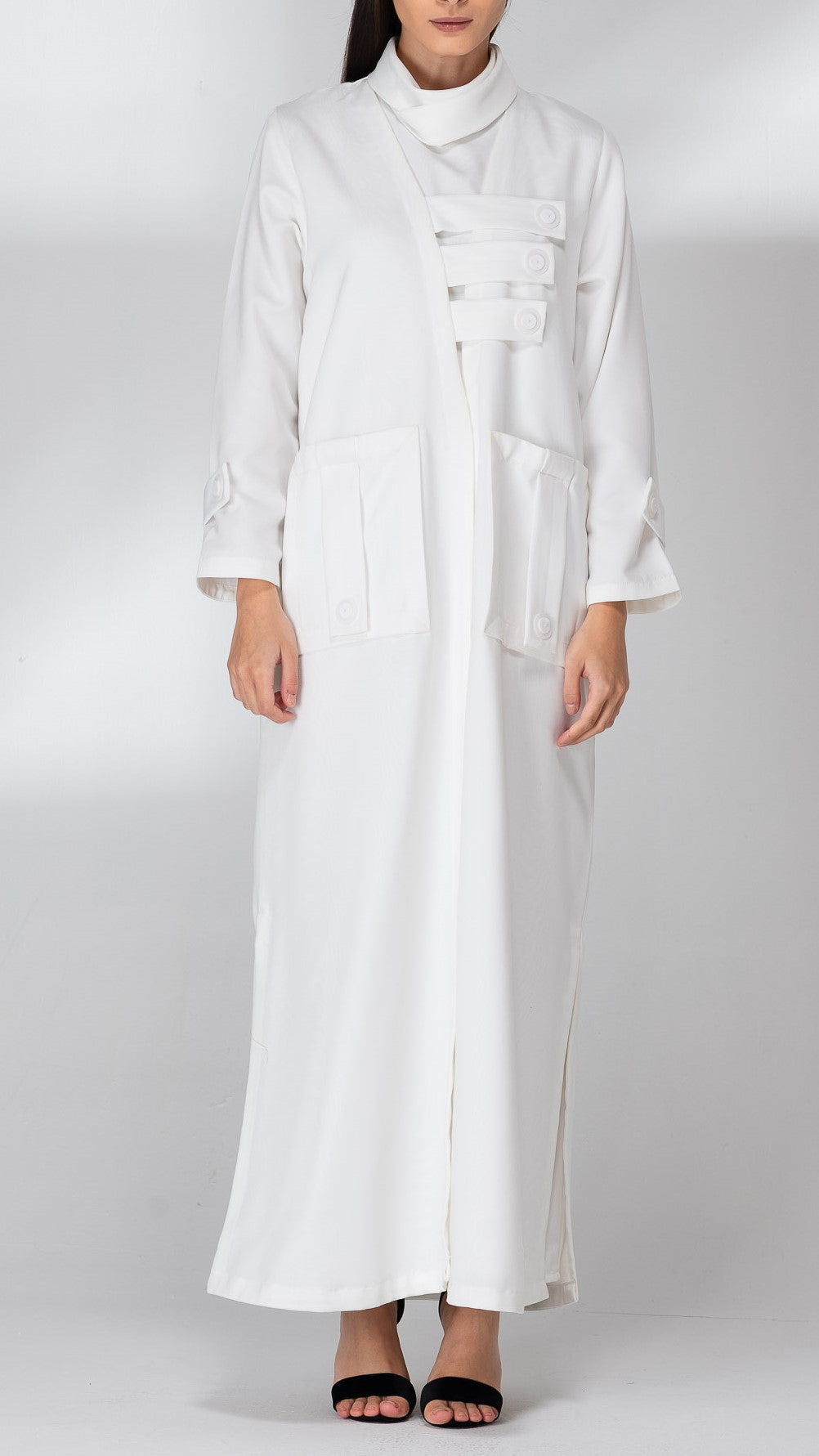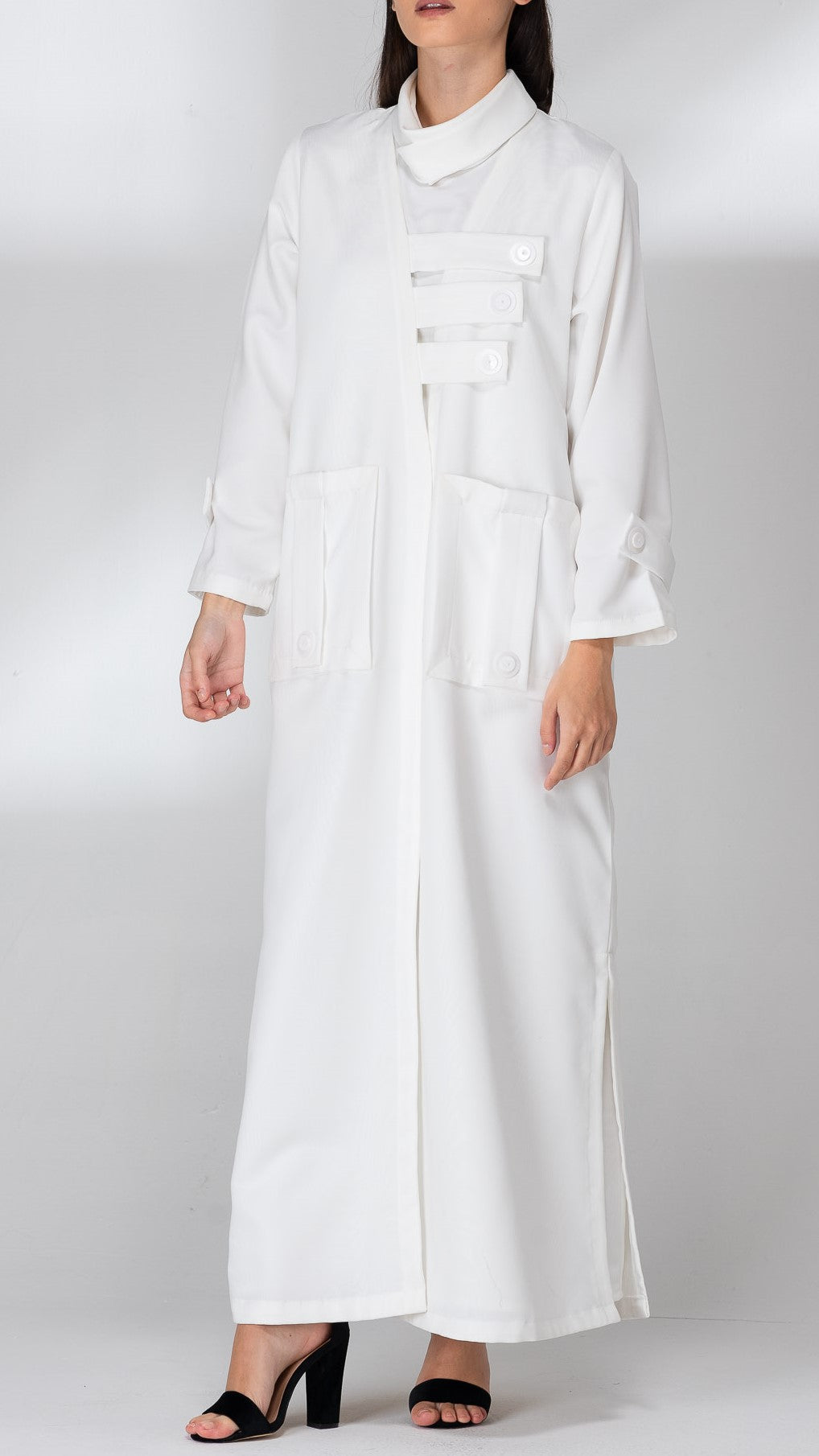 A classic white abaya with white straps on the chest and pockets made with the same fabric. Open abaya from the bottom on both sides. Suitable for daily wear.