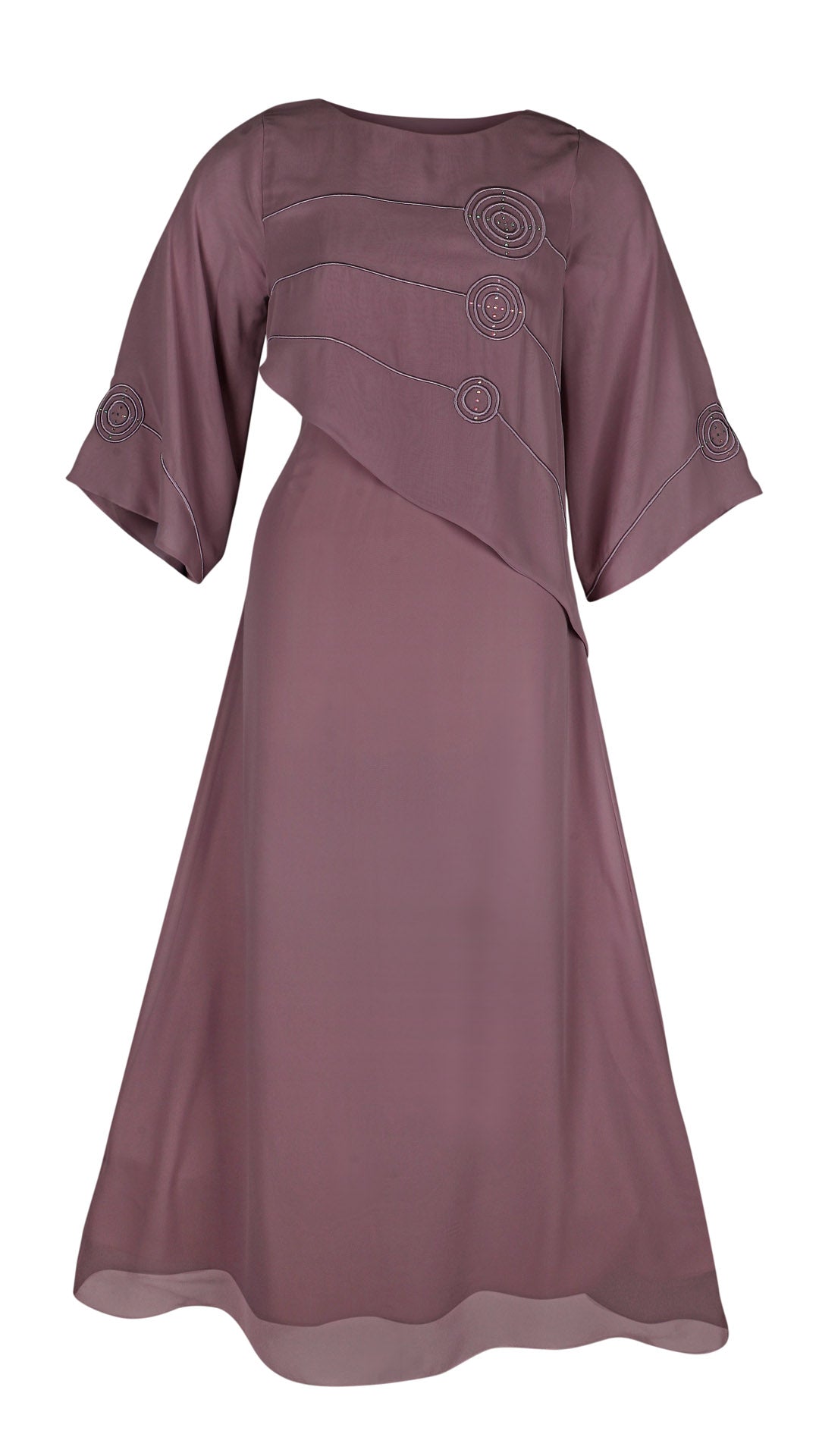 This stunning A-line long Jalabiya features a round-shaped neckline and 3/4 cloche-length sleeves, offering a graceful and flattering fit. The design is enhanced by an additional layer on the front, adding depth and flow to the silhouette. It is beautifully embellished with intricate machine embroidery and sparkling crystals, which adorn both the front and the sleeves, creating a refined and luxurious look. Made from lightweight chiffon fabric, this Jalabiya exudes elegance and sophistication, making it perfect for formal gatherings or special occasions where traditional beauty meets modern flair.