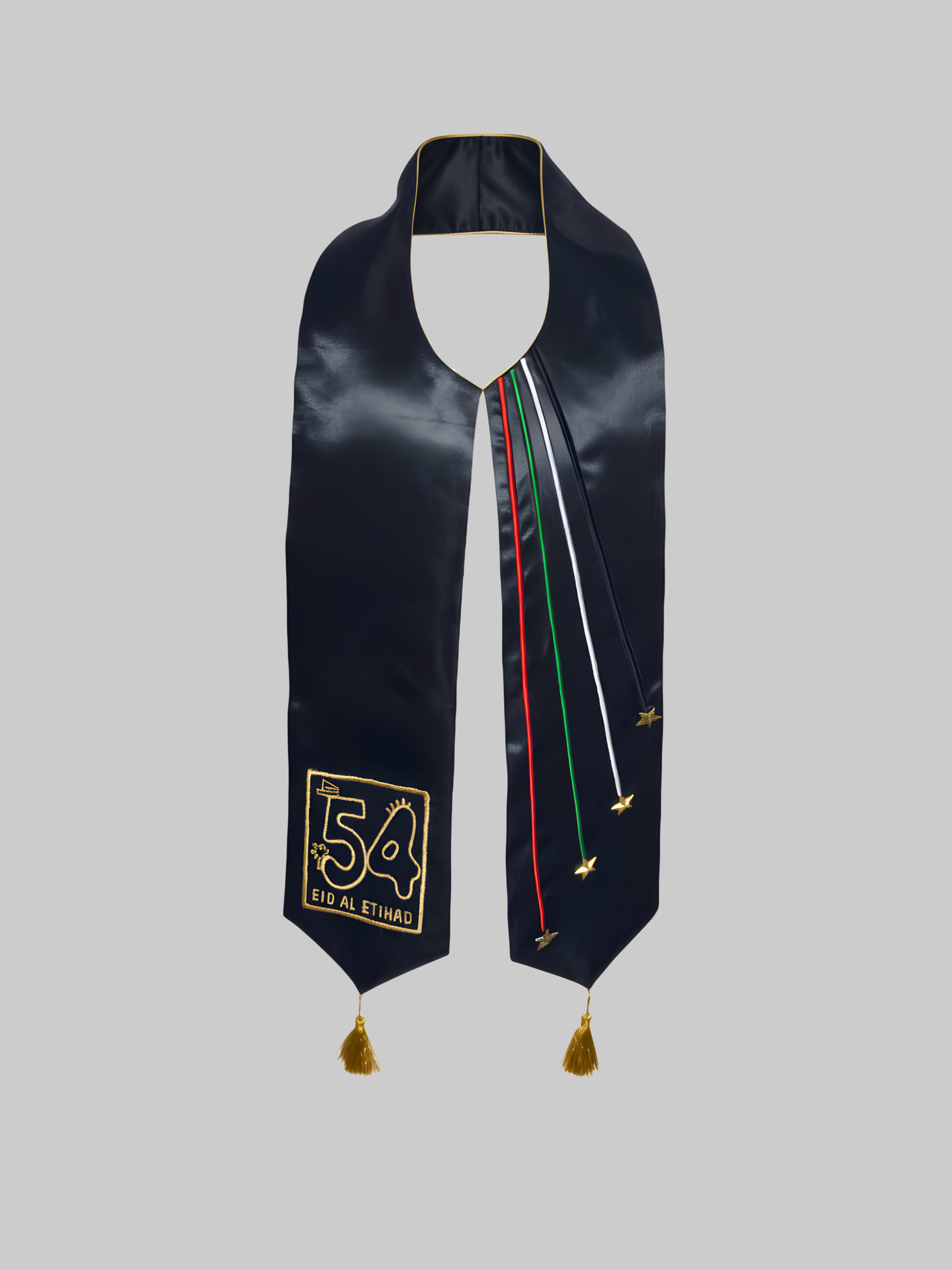 A stunning gold ceremonial stole measuring 58 inches in length, designed to celebrate the spirit of the UAE with elegance and pride. Made