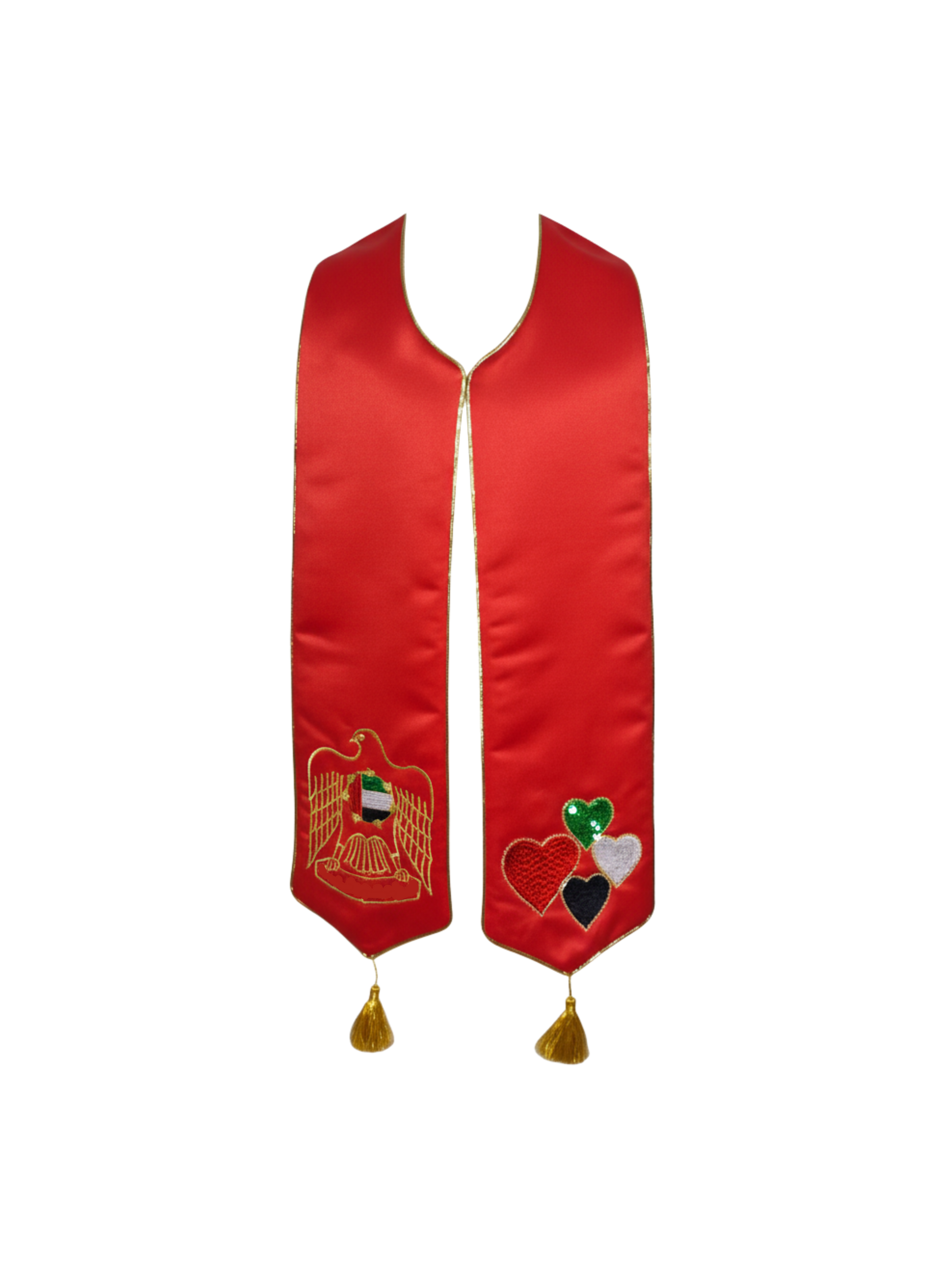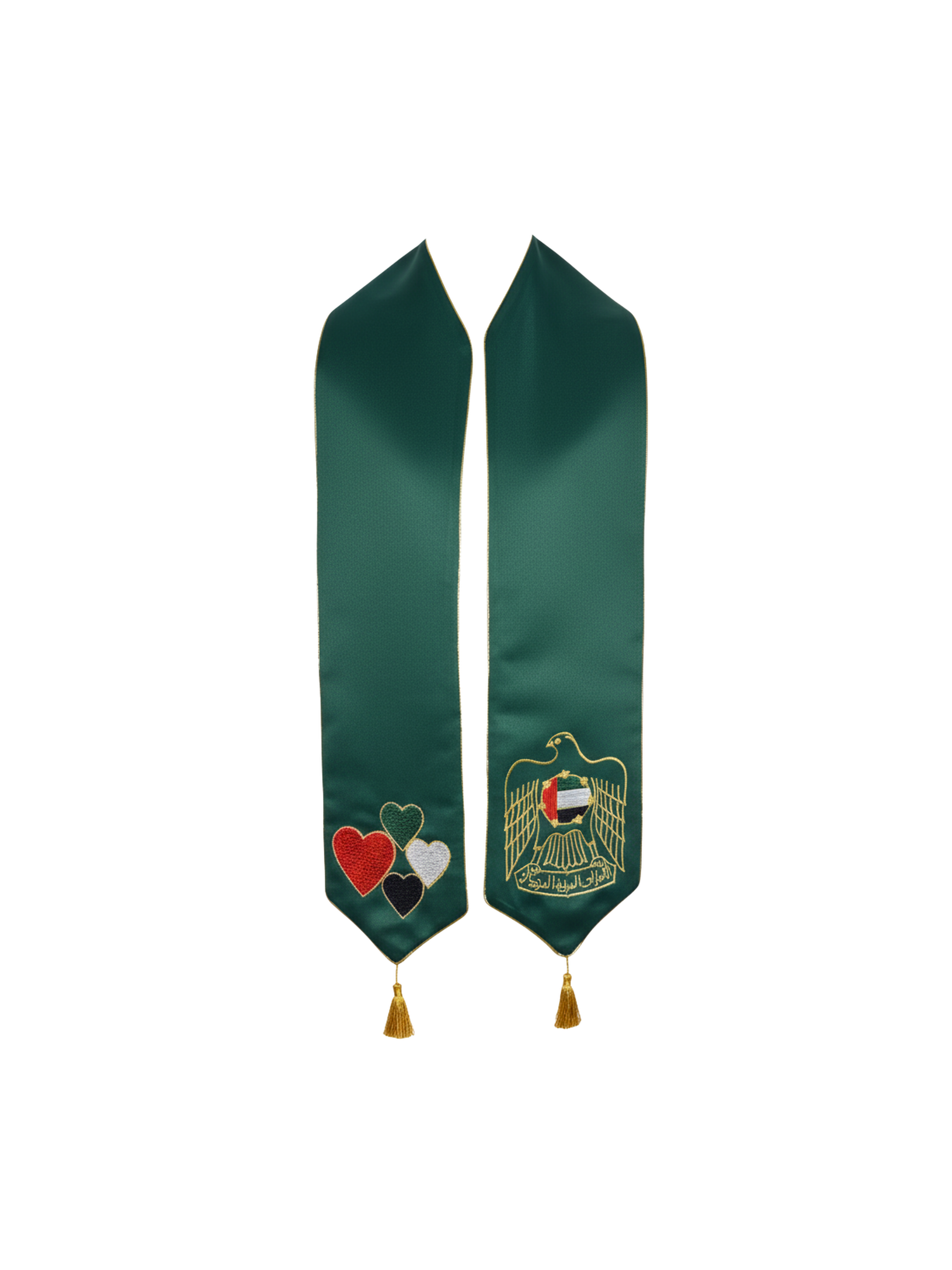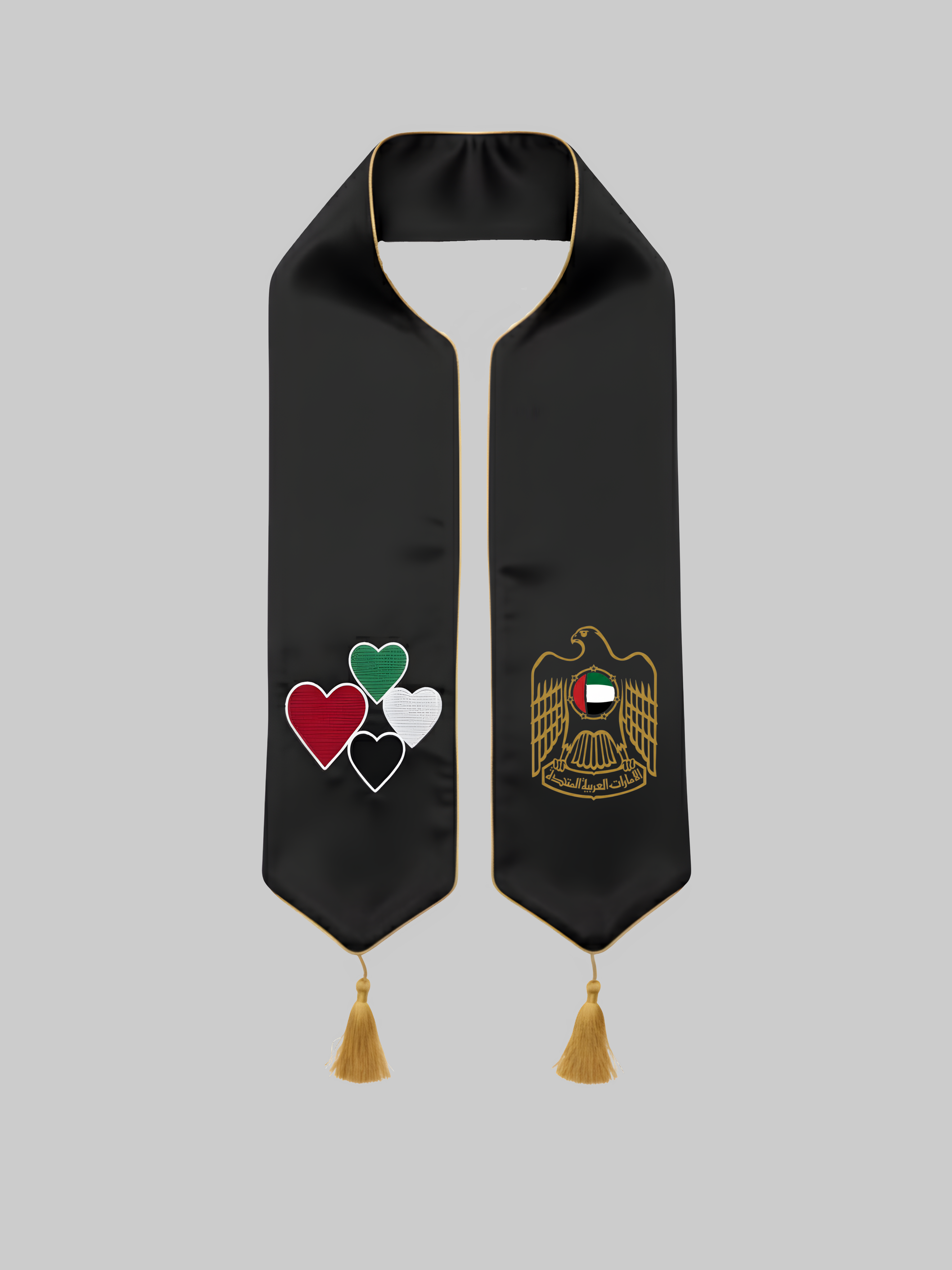 An elegant gold ceremonial stole measuring 58 inches in length, crafted to embody UAE national pride with refined sophistication. The stole