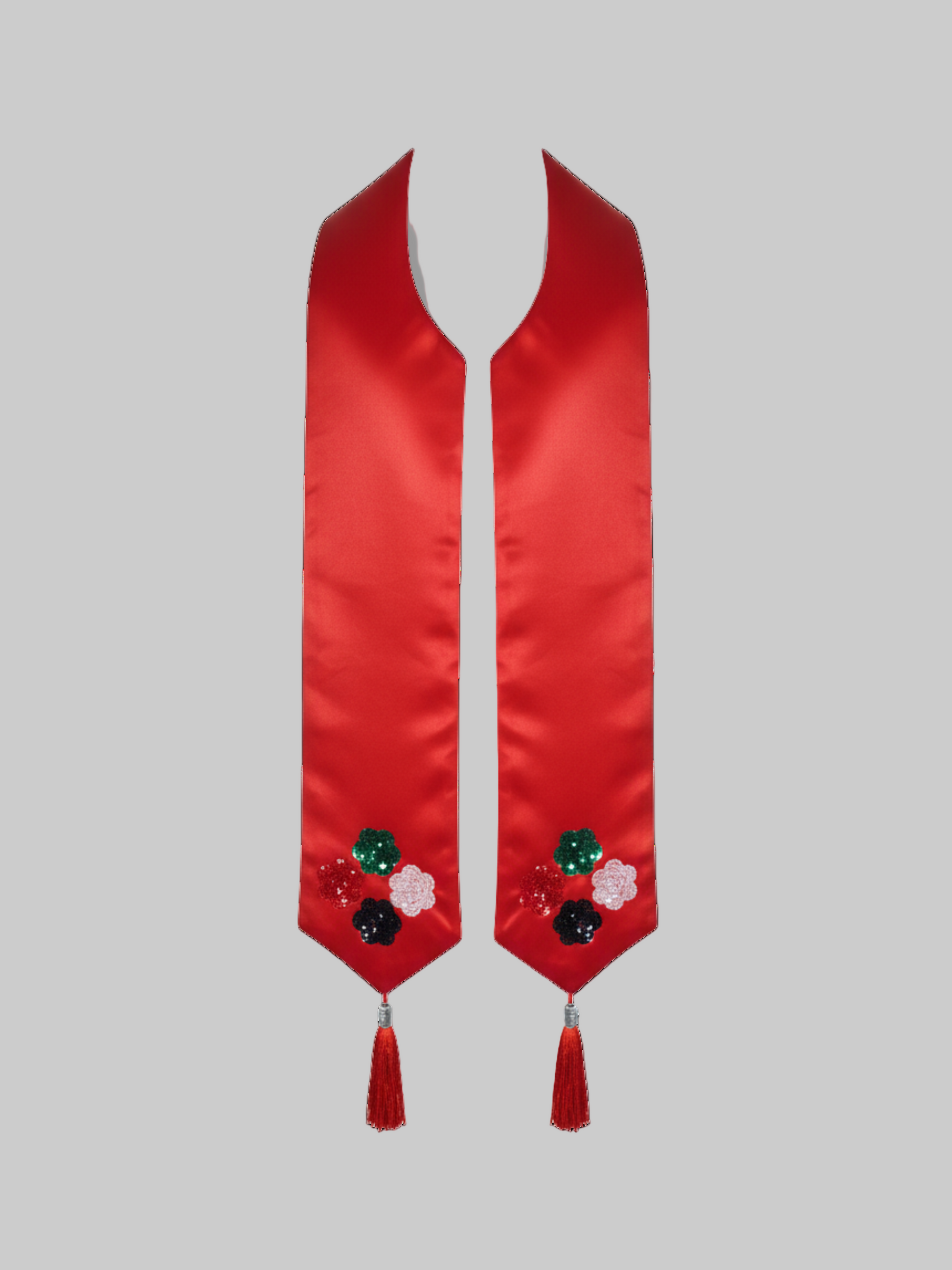 subtle shimmer that enhances the rich satin fabric. The design is finished with red tarboush tassels, bringing a striking contrast and