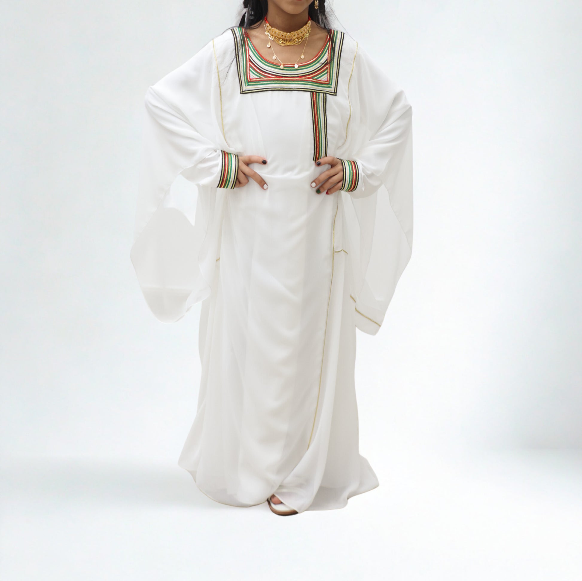 embellished along the neckline with UAE flag colors talli lace and bordered with luxurious gold talli lace for a refined finish. An attached belt